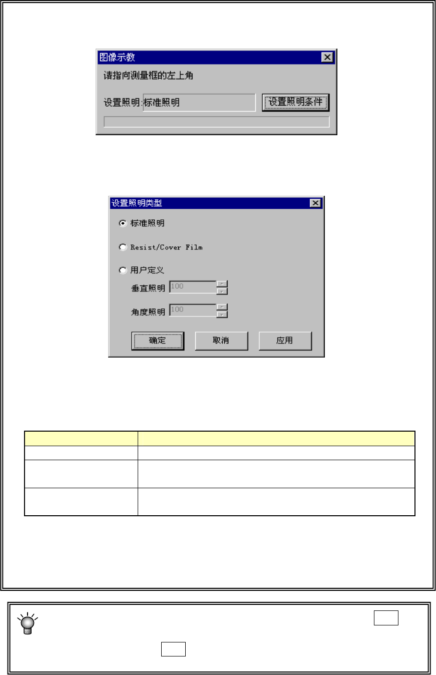 第1部 基本篇 第4章 生产程序制作 ● 当标记识别不稳定时,按下照明条件设置按钮,设置 照明图案 。 请在指定测定框的左上方前,设置照明图案。 图 4-5-2-3-1-3 照明条件设置 按下设置照明条件按钮,显示如下画面。请进行照明图案的设置。 图 4-5-2-3-1-4 照明图案设置 ·可通过<应用>按钮来确认所设置光量下的图像。 照明图案 处理 标准照明 识别通常的基板标记时使用。 RE GI ST/ CO VE R …