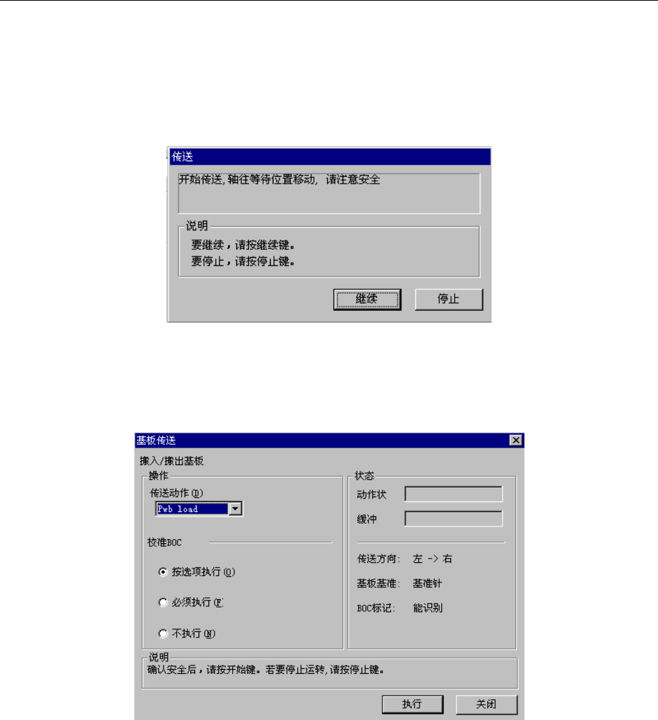 第1部 基本篇 第4章 生产程序制作 4-5-4-1 传送 4-5-4-1-1 基板搬入/基板搬出 进行基板的搬入及搬出。 当安全盖打开时,选择菜单后,为了将轴移动到等待位置,显示如下信息。 确认安全后,请按下“继续”。 图 4-5-4-1-1-1 确认安全 将轴移动到安全位置后,显示如下的基板传送画面。 图 4-5-4-1-1-2 基板传送 ·按<START>开关或“执行”进行传送。 ·结束操作时,请按“关闭”。 ·在传送…