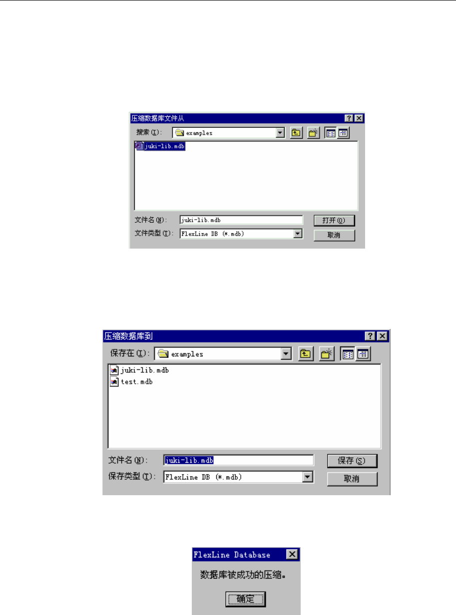 第 1 部 基本编 第 5 章 数据库 5-6-1-2 Flexline数据库压缩 如果长时间使用数据库文件(反复增加、删除),文件中无用的区域会不断增加。执行 “Flexline数据库压缩”后,删除该未使用区域,缩小文件大小。 <步骤> 1) 从菜单栏中,单击“工具”/“数据 库工具”/“Flexline 数据库压缩” 。 2) 显示“压缩原数据库文件的画面” 。 选择文件,单击“打开”。 图 5 -6-1-2-1 ※现在…