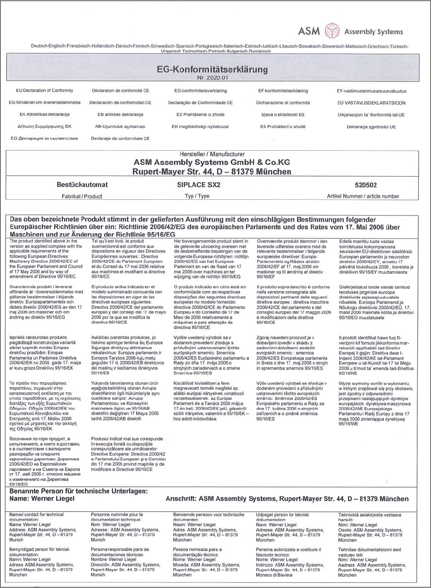Manual de operação SIPLACE SX1/SX2 Edição V2 e V3 8 Anexo A partir da versão de software SR.713.1 Edição 12/2020 PT 8.1 Declaração de conformidade CE 343 8 Fig. 8.1 - 4 SIPLACE SX2 (520502) - página 2