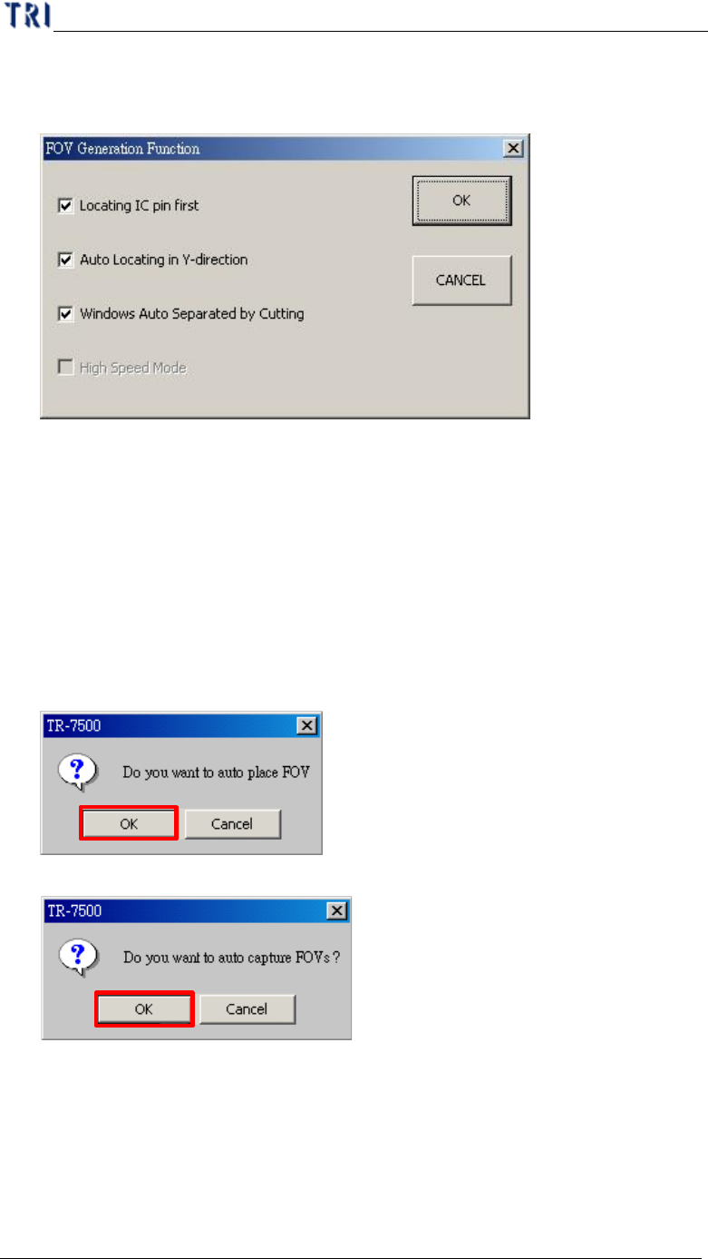 C h a p t e r 1 AO I S t a nd a r d P r o j ec t Cr ea t i on T R 7500 U S E R M A N U AL 46 8 . FOV G e n e r a t e ( 1) S e tt i ng t h e b e s t F O V d i s t r i b u t i o n r u l e f o r AO I i n s p e c t i o n . T…