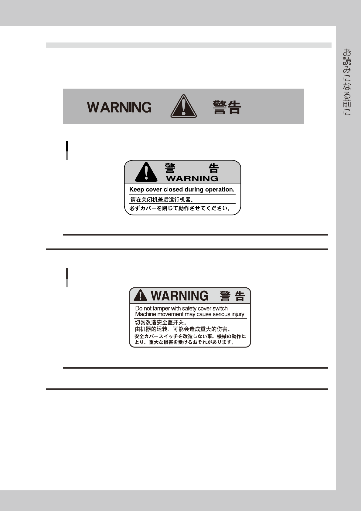 カバースイッチに触れたり、改造しない。カバースイッチが解除された状態で運転をすると、マシンの可動部が体に触れてケガ