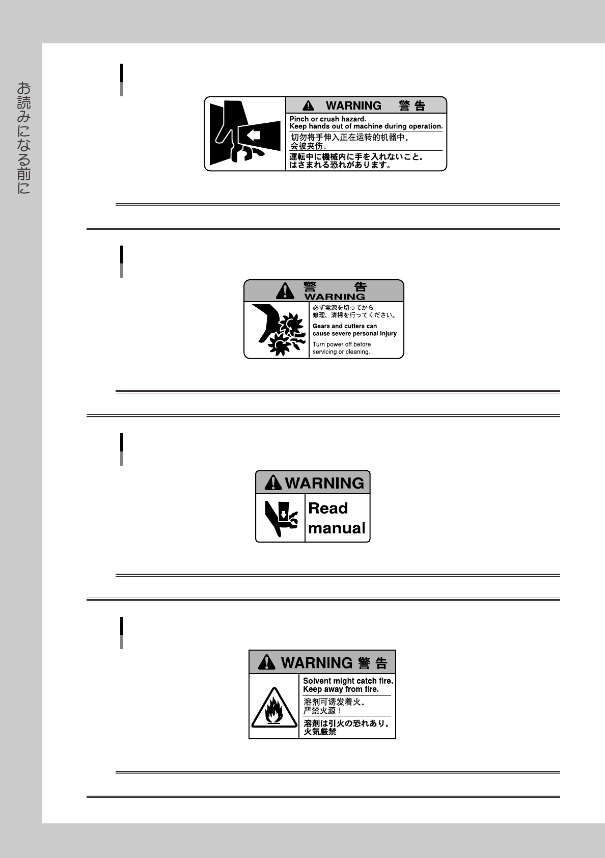 機械には警告ラベルが貼られていますので、内容を確認して指示を必ず守ってください。ここでは、サーフェ