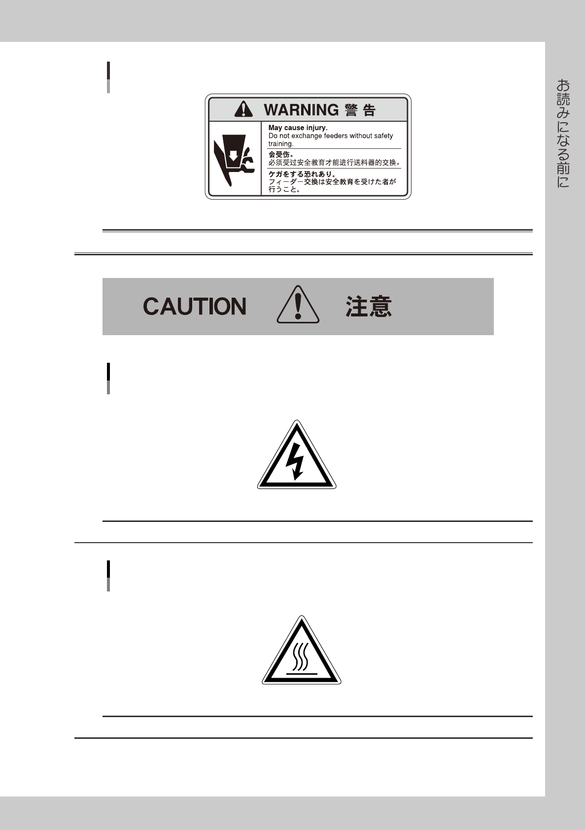 vii ケガをする恐れあり 22 0 01 - G0 -0 S w 警告 フィーダーの交換作業は、 安全教育および正しい操作についてトレーニングを 受けた人が行ってください。 高圧注意 触れると感電の恐れあり 22 0 01 - G0 -1 C c 注意 カバー内の電源部に触れると感電する恐れがありますので注意してください。 高温注意 触れるとやけどの恐れあり 22 0 01 - G0 -1 D c 注意 可動部のモーターは高温にな…