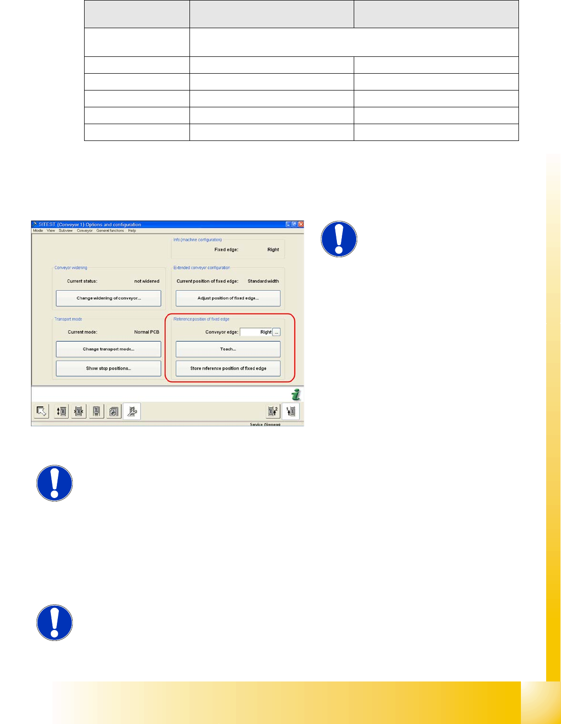 The fixed conveyor side should be adjusted only with the SITEST software and