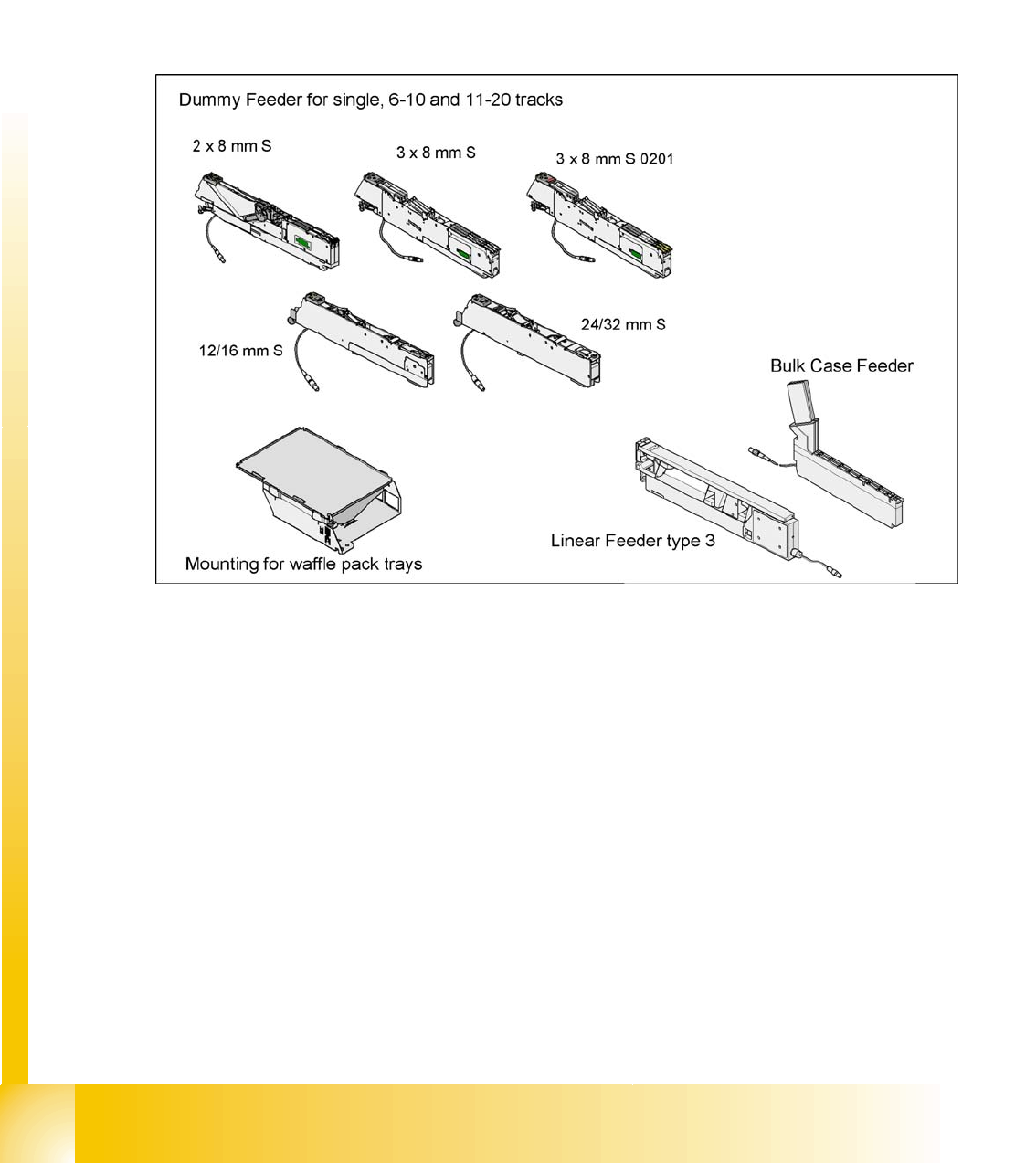 Description: 9 different feeders are enough to process tapes with widths from 8 to 88 mm. The tape reels