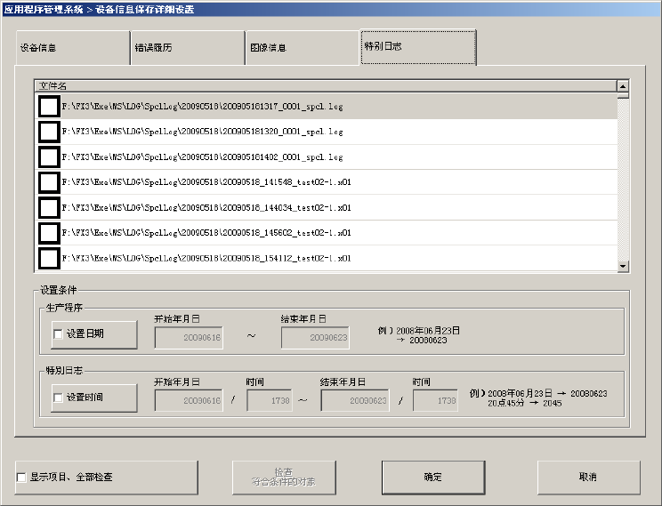 在条件设置的特別日志中,选中[设置时间],并指定开始年月日/时间至结束年月日/时间,按下[检