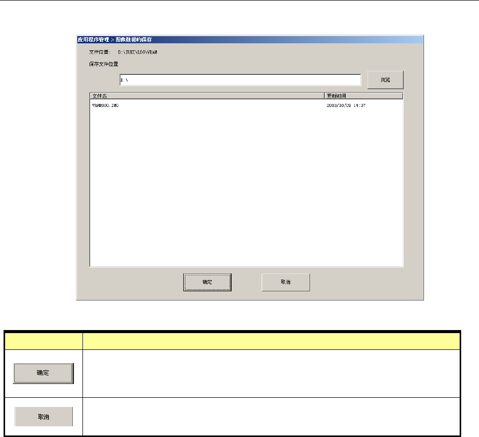 第 1 部 基本编 第 1 章 设备概要 1-5-10 图像数据的保存 使用“图像数据保存”功能,可把生产过程中的错误图像文件,复制到指定的驱动器里。 使用该功能时,请按 Ctrl + F12 按钮。 图 1-5-10-1 将图像数据保存到 FD 的对话框 按钮 说明 将图像数据保存到指定的驱动器后,关闭图像数据保存对话框。 关闭图像数据的保存对话框。 1- 92