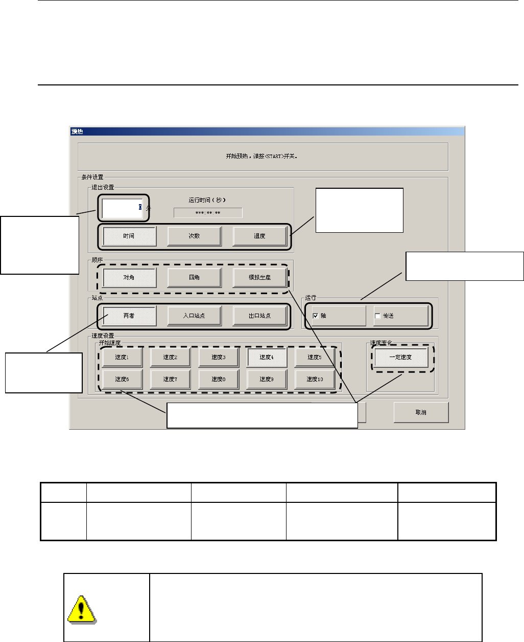 从主画面的菜单栏中选择“维护”→“预热”后,显示如下预热初始化画面,请设定预热条