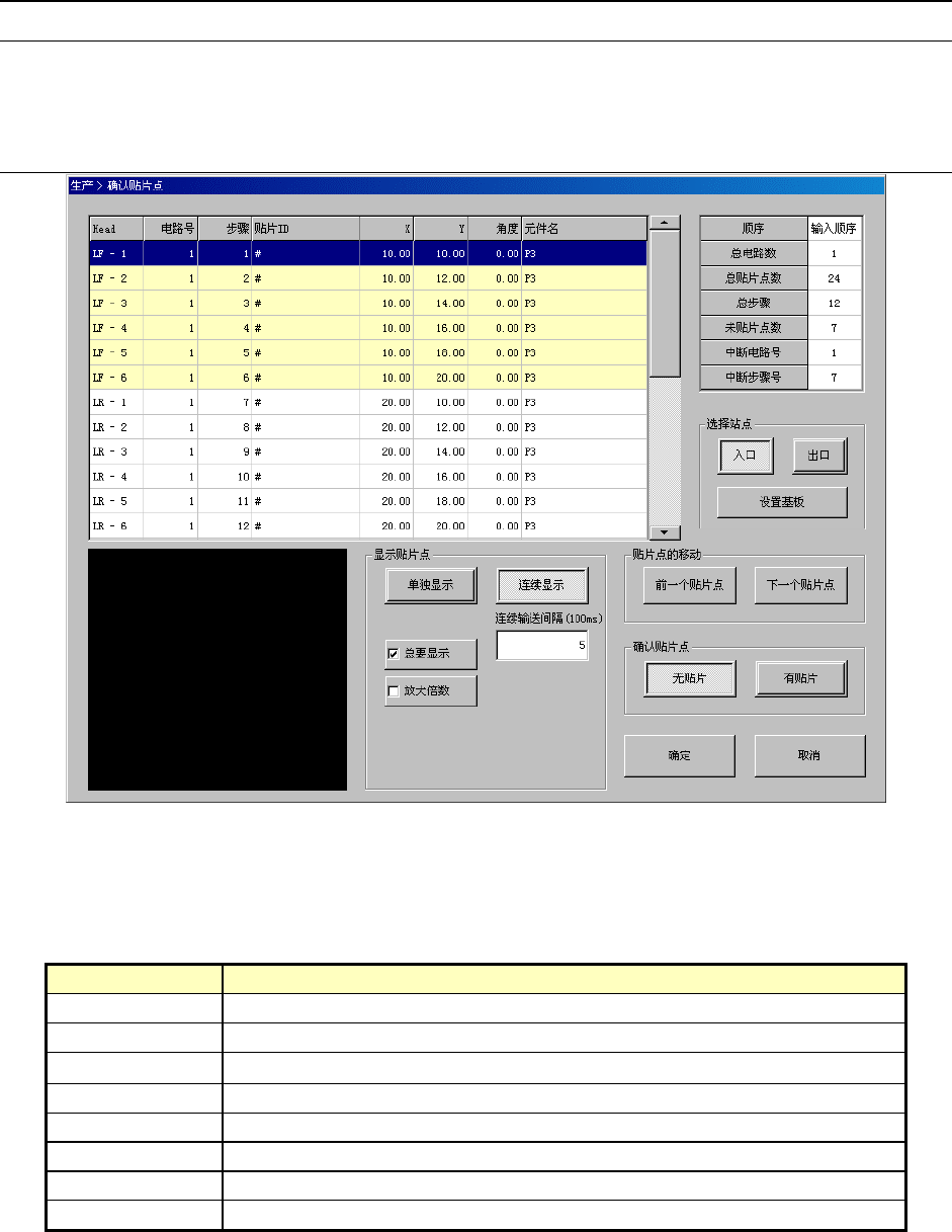 在生产开始前显示各贴片点列表,可以检查元件是否已全部贴片,确定是否继续生产、进行贴片。