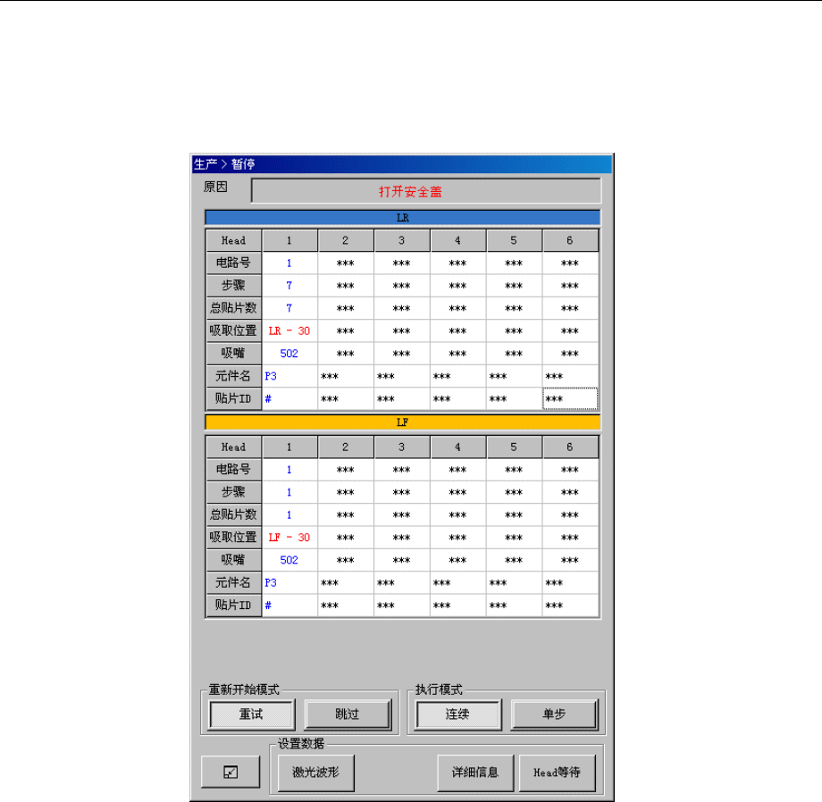 此时,对应的站点将立即暂停,另一侧的站点在把吸取中的元件贴片/废弃后暂停。在生产中打开