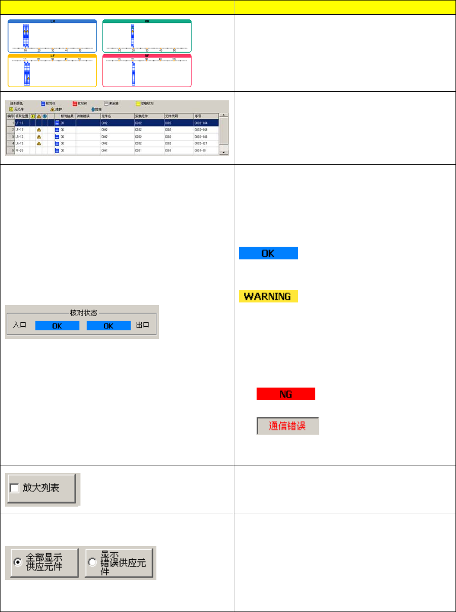 第 1 部 基本编 第 2 章 生产 (3) 核对画面的构成 项目 说明 图像查看 用图来显示供料器的安装状況和核对状況。 供料器状況列表 通过列表的过滤来选择条件, 符合条件的供料 器信息被显示。 显示每个站点核对状态的状态。 开始生产时,必须是两站点均为核对 OK 或非 报警才能开始生产。 生产临时停止后重新开始时, 如果各站点是核 对 OK 或报警,可以重新开始生产。 (蓝色背景“OK” ) 所有供料器为核对 OK 的状态, 可以…