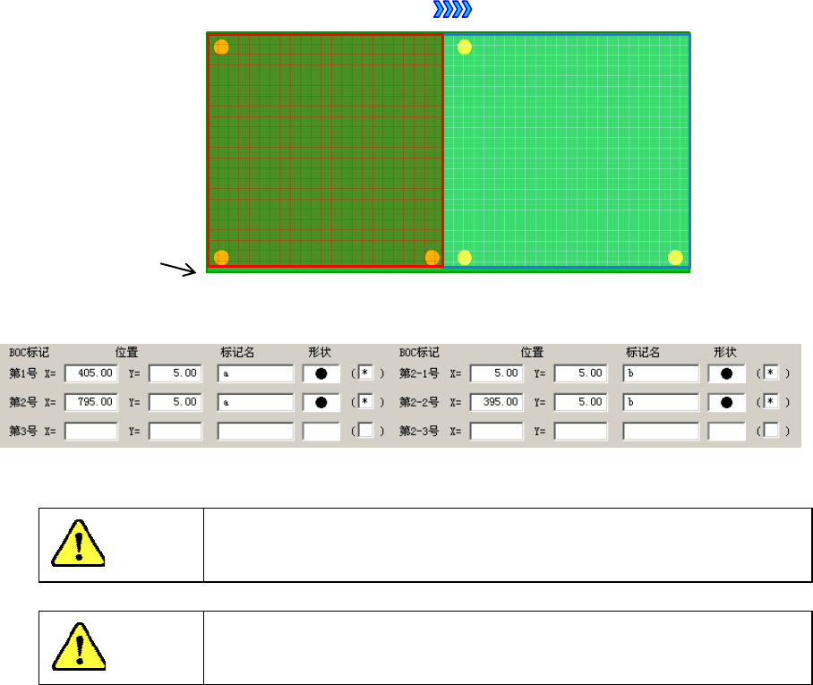 第1部 基本编 第4章 制作生产程序 4-18 * 使用长尺寸基板对应选购项时 在基板外形尺寸X超过规定尺寸的大型基板中, 要对第1次夹紧时贴片范围的BOC标记(以下称 第1BOC标记),以及第2次夹紧时贴片范围的BOC标记(以下称第2BOC)进 行设置。 例) 单板基板 左→右传送,基板尺 寸为800mm时,按照示例输入第1BOC标记设置及第2BOC标 记设置。 注意 当有标记坐标的设计值(CAD 数据)时,绝对不要进行 X、Y 坐标…