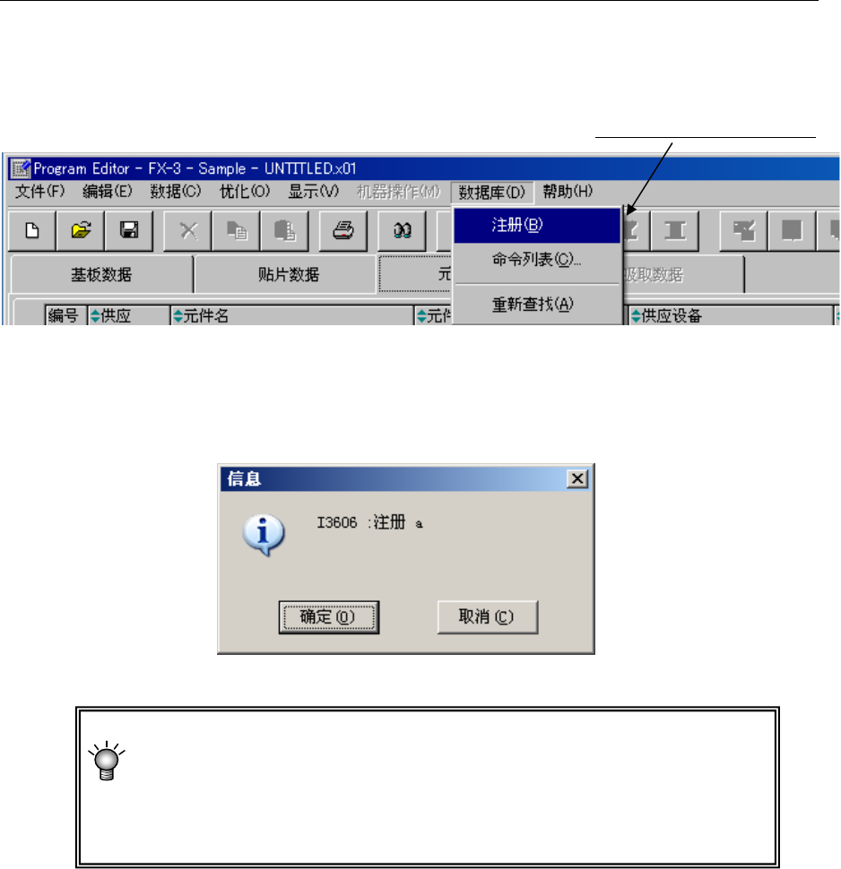 ②选择要注册的元件(若是清单画面,请先单击元件所在行),再单击“数据库”-“注册”。