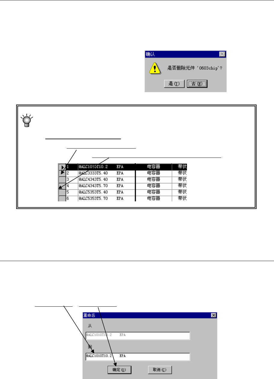 第1部 基本编 第5章 数据 库 5-15 5-1-3-5 删除 删除元件名。 <步骤> ①选择要删除的元件名,在菜单栏中单击“数据”-“删除” 。 ②出现右图所示的确认信息。 单击“是”后,即可删除。 图 5 -3-5-1 删除多个元件的方法: 先指定删除范围,再进行删除。 ●在数据库中指定范围的方法 :以指定下列第 1 行至第 3 行为例: 首先,点击要删除的第一个元件 。 然后按住“Shift”键,再单击要删除的最后元…