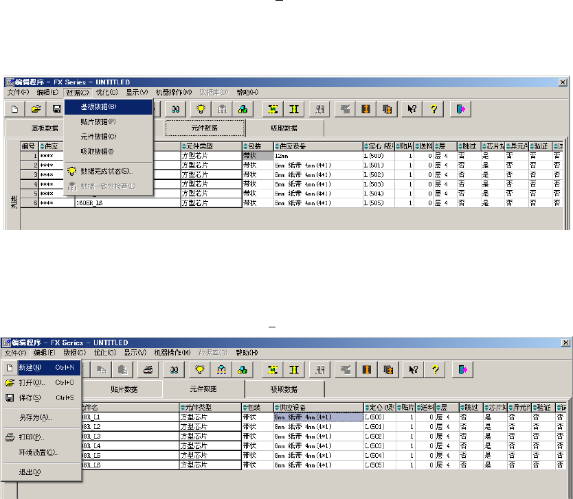 第 1 部 基本编 第 1 章 设备概要 b) 使用快捷键 按菜单上显示的下划线字母(如[文件]中的“ F ”),便可选择和执行该项。 先用[Alt]键激活菜单栏, 再按下[C]键, 则会显示[数据]下拉菜单。按下[ P]键即可执行[贴 片数据]。 图 1-3-4-1-4 用快捷键选择菜单 此外,在下拉菜单内,如果项目右侧显示组合键,则不必激活菜单栏即可直接执行该项目。 菜单未激活时,按[Ctrl+O]键执行[打开...( O )] 图…