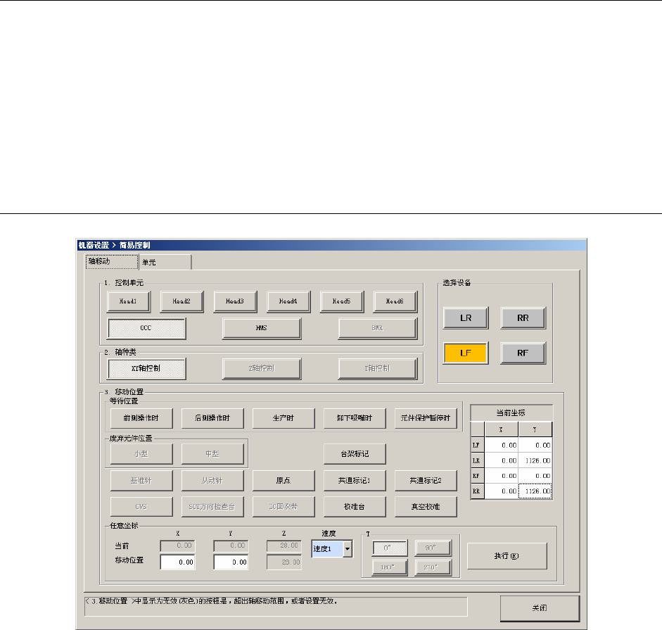 第2部 基本编 第7章 机器设置 7-5-2 控制轴移动 7-5-2-1 控制XY轴 XY 轴的移动如下所示。在主画面上选择控制单元,即可移动轴。 ※ 可设置基准针、从动针、CVS、SOT 方向检查台、IC 回收带为有效。 ※ 从“Head 的吸嘴有无状况”启动简易控制画面后,只能对以下项目进行操作 ・ 控制单元 :选择 Head1~6(贴片头) ,OCC,HMS,BM R ・ XY 轴控制:“前侧操作时,后侧操作时,卸下吸嘴时” ,任…