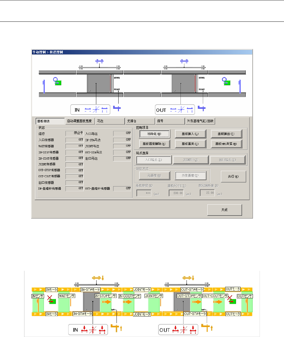 在传送控制画面的上方,通过图形方式显示传送马达/传感器现在的状态。