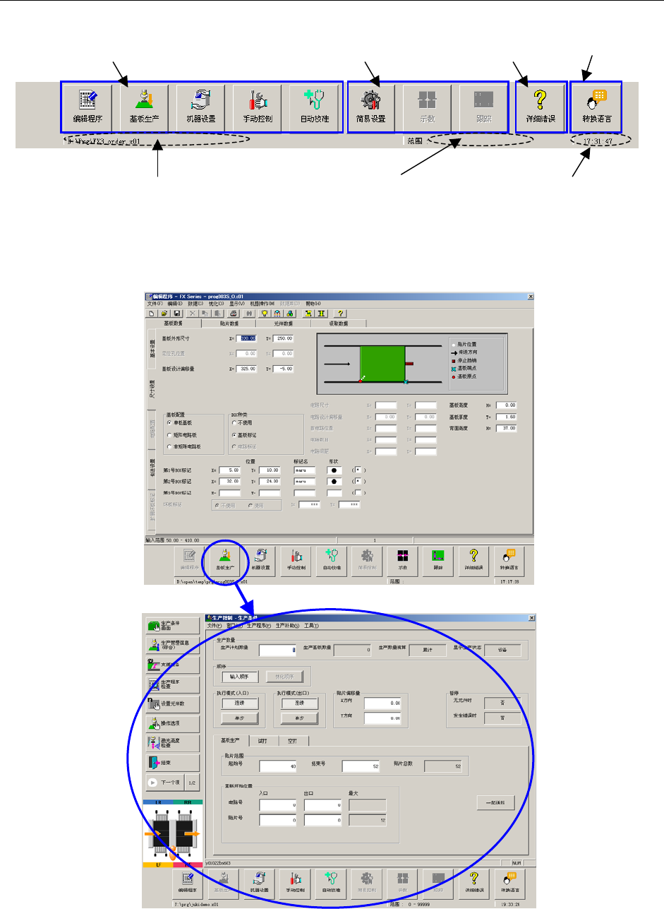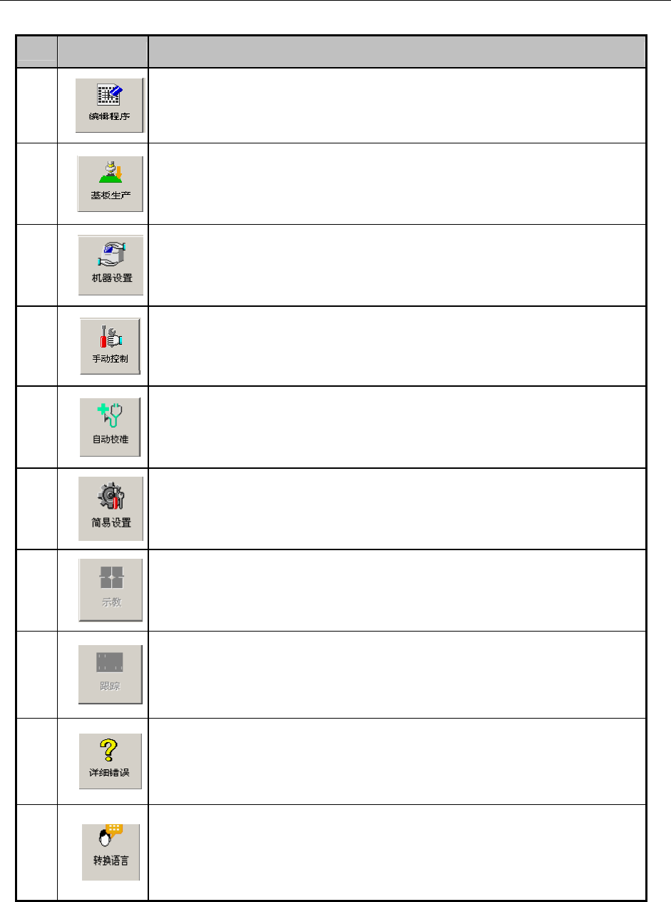 第 1 部 基本编 第 1 章 设备概要 1-4-3-1 功能栏的种类 FX-3 画面下部设有功能栏,便于迅速切换应用程序。功能栏的种类说明如下: No. 图标 名称和说明 1 程序编辑 结束当前启动中的应用程序,启动程序编辑。 2 基板生产 结束当前启动中的应用程序,启动基板生产程序。 3 机器设置 结束当前启动中的应用程序,启动机器设置程序。 4 手动控制 结束当前启动中的应用程序,启动手动控制程序。 5 自动校准 结束当前启动中的…