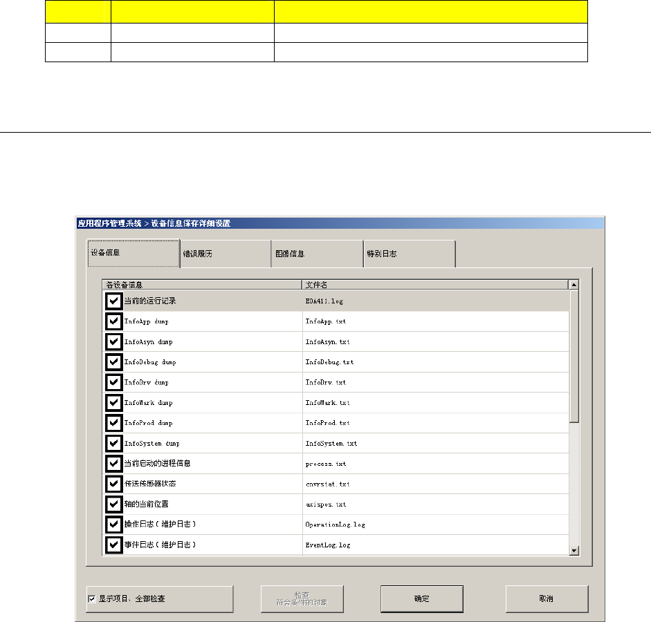 第 1 部 基本编 第 1 章 设备概要 在设备信息的取得设置中, 如 “特別日志” 带有选中号, 将进行以下文件夹的压缩保存。 (当特別 日志未生效时,不能选中。 ) 保存对象文件夹:D:\JUKI\LO G\ SpclLog No. 文件名 内容 1 20080610 \ xxxx.log 每个日期文件夹的特別日志文件 2 20080610 \ xxxx.x01 特別日志用的生产程序 1-5-9-2 设备信息之取得信息的详细设置 对…