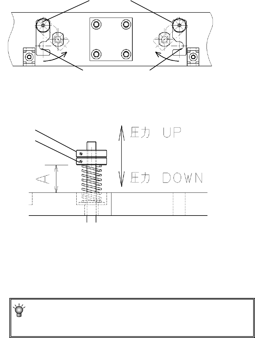 第1部 基本篇 第2章 生产 2-7-1-3-1 夹杆压力的调整(外形基准时) 对于薄基板夹板时的弯曲、裂纹等,可以通过降低 Y 夹杆的压力进行对应。 调节螺母 2 调节螺母1 行程垫片 垫片锁止 图 2-7-1-3-1-1 夹杆压力调整整体图 2-35