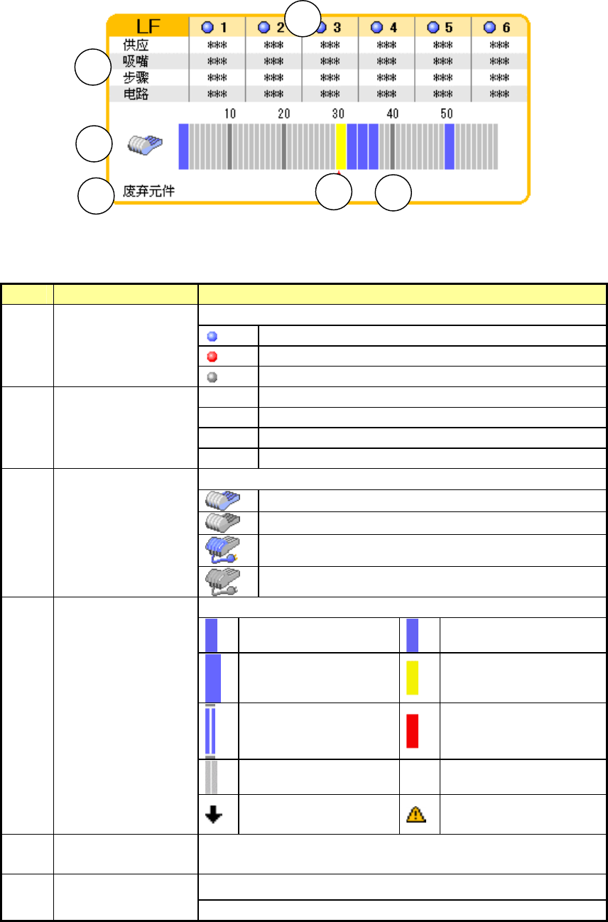 第1部 基本篇 第2章 生产 (2) 显示各贴片头、台架信息 1)显示 各贴片头及供料器台架的状态用图示符号显示。 图 2 -8-3-2-3 贴片头、供料器台架信息显示 2)图示符号的说明 No 项目 显示 显示贴片头的使用状态。 贴片头正常使用状态 贴片头错误状态 1 贴片头 贴片头未使用状态 供应 显示贴片头吸取元件的位置。 吸嘴 显示贴片头安装的吸嘴号。 步骤 显示元件贴装的步骤号。 2 贴片头的信息 电路 显示元件贴装的电路号。…