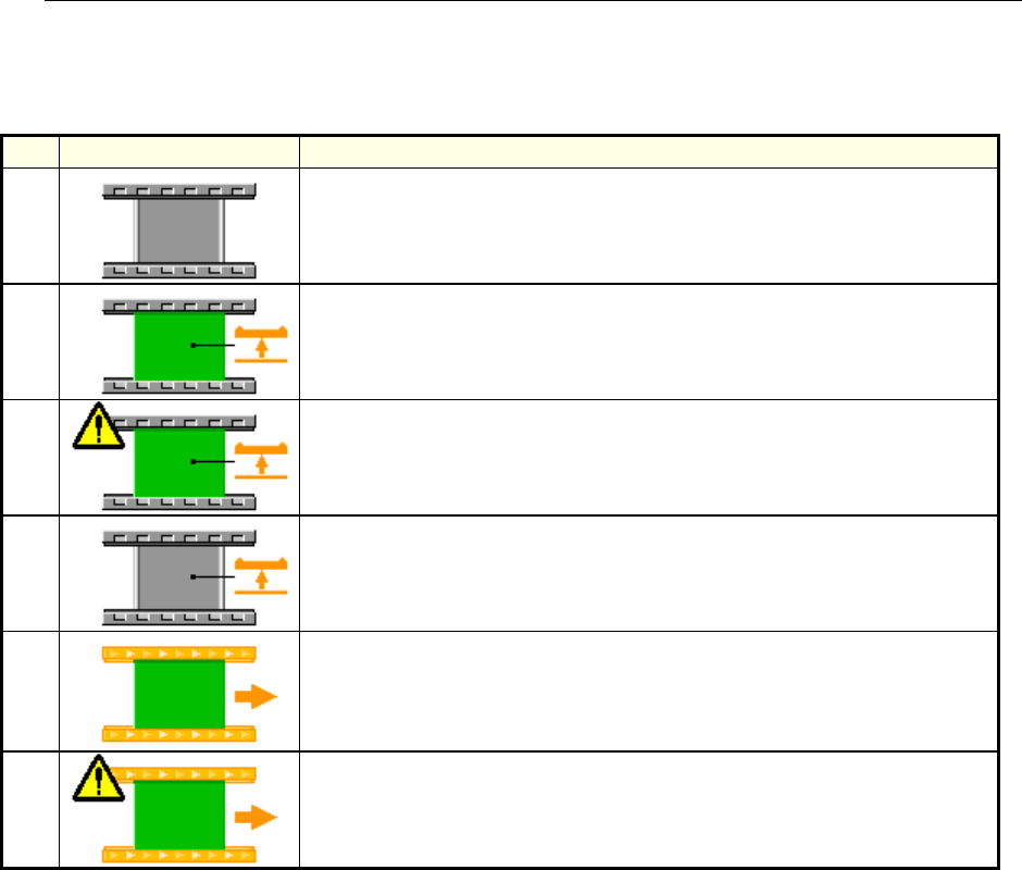 第 1 部 基本编 第 2 章 生产 2-14-2-3 传送通道上的基板状态以及操作内容 基板的状态图像显示,随着继续生产、所选择的操作方式,以及传送通道上的基板状态而变化。 点击图像可执行重夹基板或搬出基板。 表 2-14-2-3-1 基板状态 No. 项目 内容 ① 传送通道上没有基板。 ② 重夹传送通道上的基板。 (在[生产动作]中选择[重夹]) ③ 重夹传送通道上的基板。 (在[生产动作]中选择[重夹]) 有可能发生缺件或者误动…