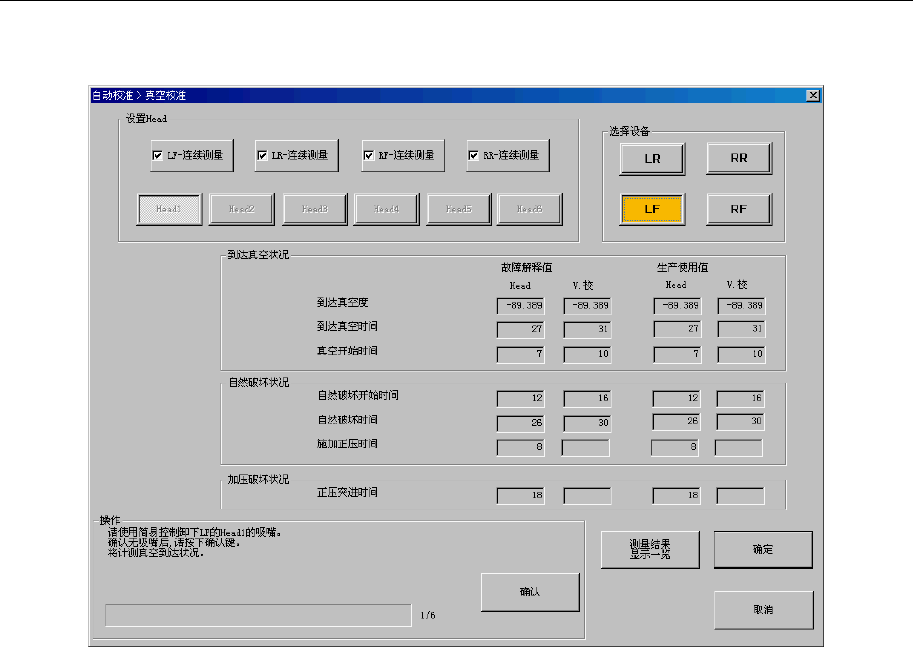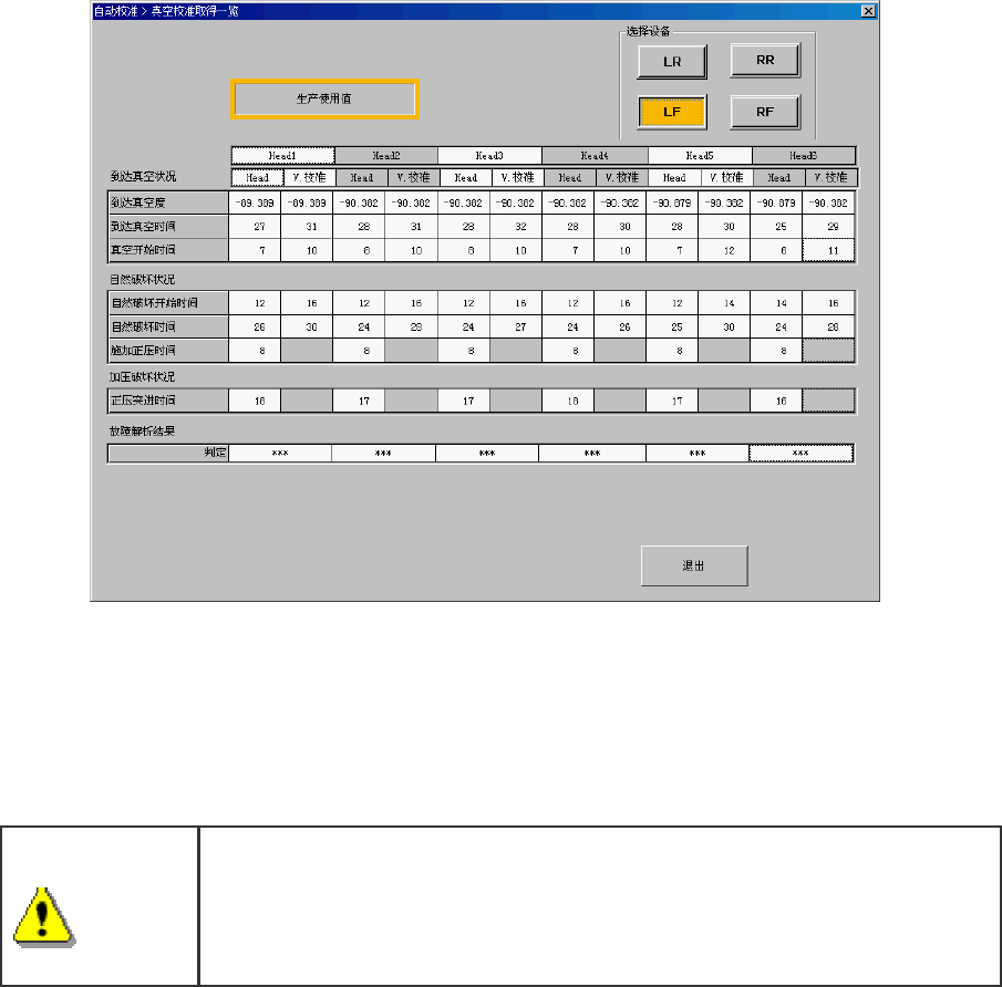以一览表画面显示所取得的真空校准的结果。显示的值是生产中使用的真空校准值。