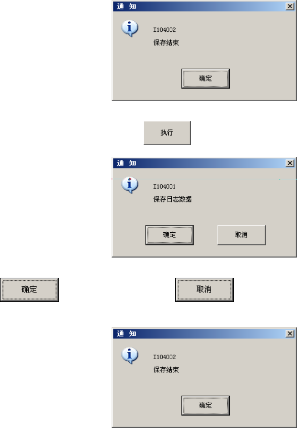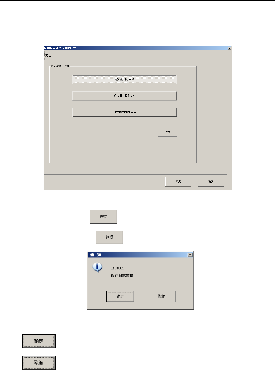 第 2 部 功能详细编 第 13 章 程序补充 13-31 13-8 维护日志 从 [ 维护 ] 菜单打开 [ 维护日志 ] 。 13-8-1 [其它] 标签 进行日志的初始化及文件保存。 图 13-8-1-1 维护日志对话框(其他) 选择[初始化日志领域]点击 ,则清除至今为止的日志的内容。 选择[保存日志数据文件]点击 ,则显示确认信息框。 图 13-8-1-2 确认保存对话框 点击 则保存。 点击 则不保存并返回。保存结束则显示信…