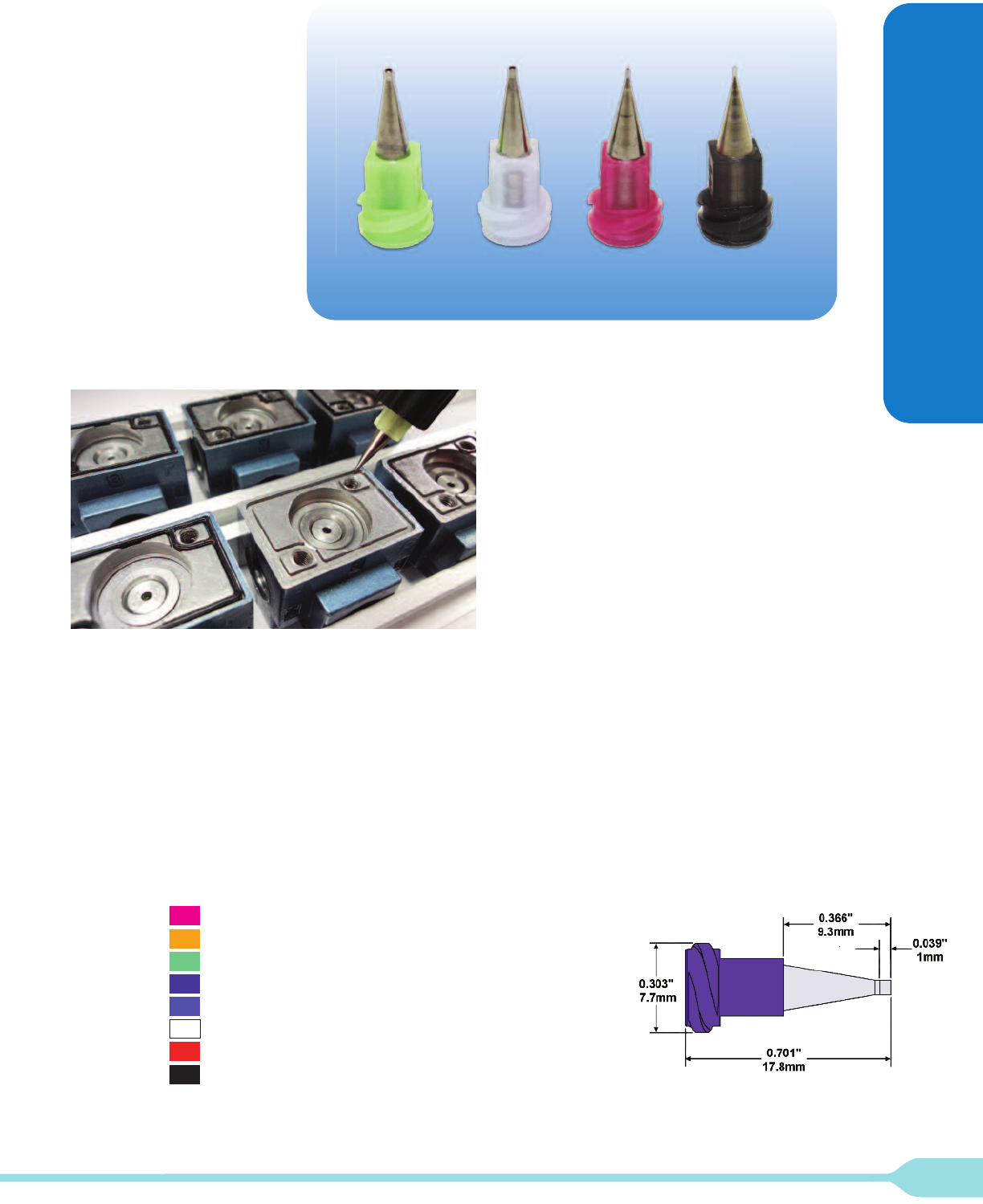 Available from 18 to 30 gauge, the MT Series tips are color coded for