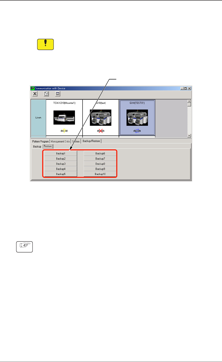 2-63 4.5.2 装置数据的复原 就从 NT-100 到装置复原线路板程序、元件数据库、系统数据的方法进 行说明。 Notice 复原将备份后更新的数据全部返回到备份时的数据。除了有数据的消 失或数据的破损等紧急时以外, 请不要使用。 在“Backup/Restore( 备份 / 复原 )” 选项卡中,按下 [Restore( 复 原 )]Tab,便显示以下选项卡。 [1] Fig.B35-16 “Restore( 复原 )”选项卡…