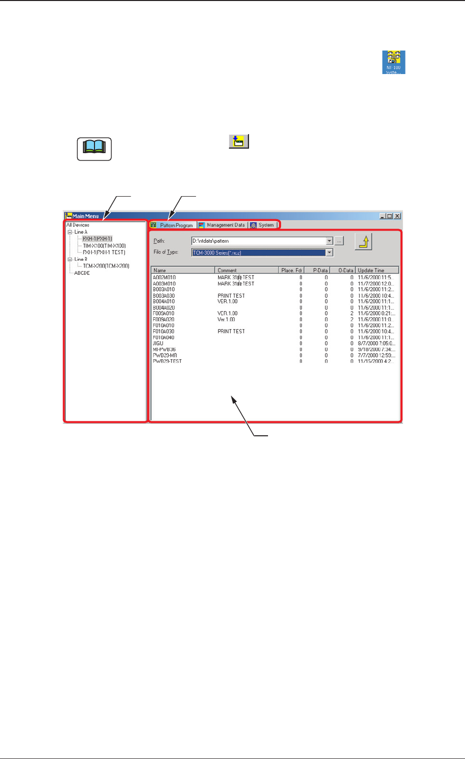 2-65 Management Data( 管理数据 ) 显示“Management Data( 管理数据 )” 选项卡。 在 [3] 中, 显示 “Management Data( 装置生产情报 )” Tab、 “Pattern Program Management Data( 各个机种生产情报 )”Tab、 “Recall Data( 情报再显示数据 )”Tab。 System( 装置系统 ) 显示出“System( 装置系统 )”…