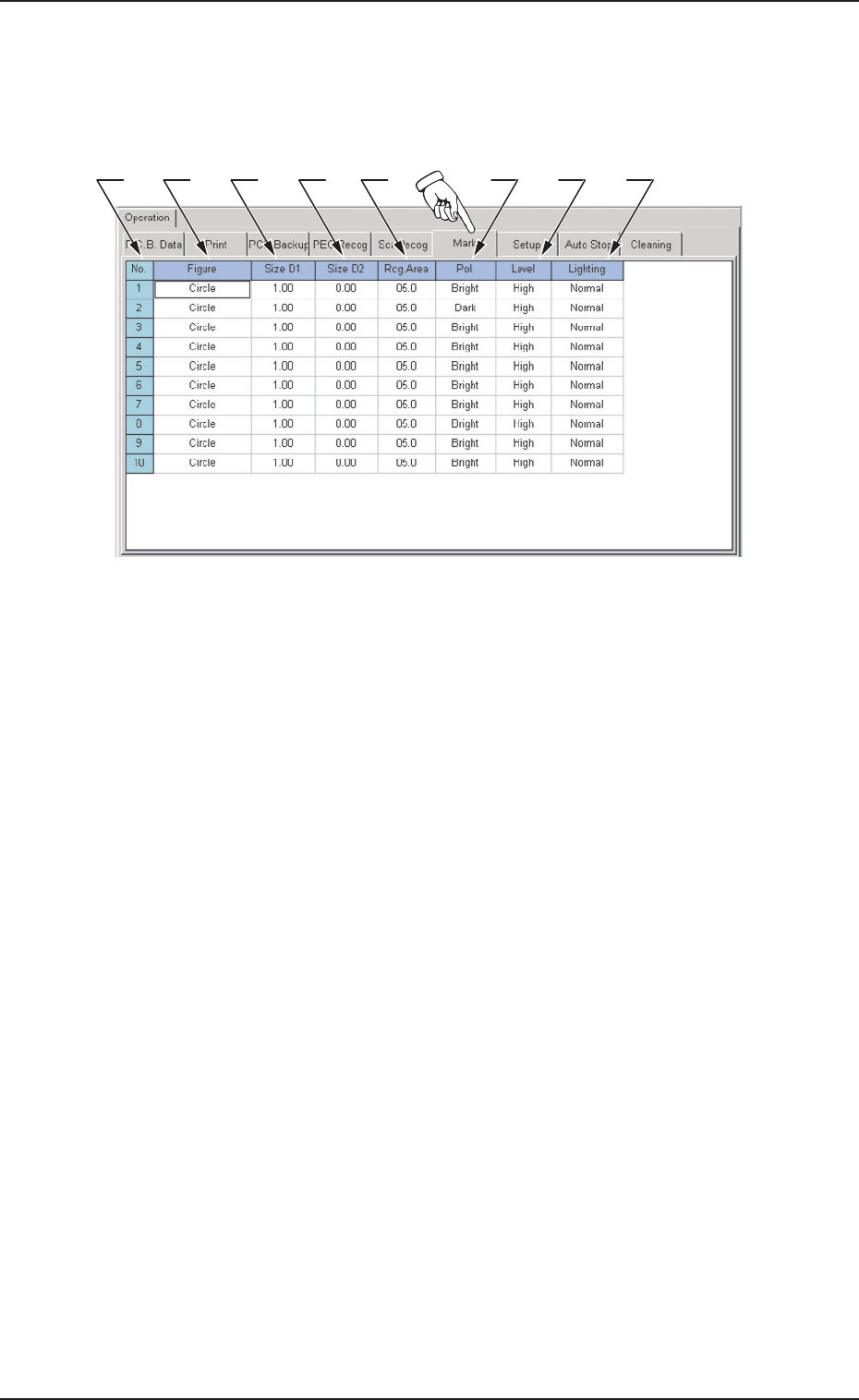 3-22 2.6 Mark( 标记数据 ) 2.6 Mark( 标记数据 ) 按“Operation( 操作数据 )”选项卡的 [Mark( 标记数据 )]Tab,便显 示以下选项卡。 [1] [6] [2] [3] [4] [5] [7] [8] Fig.C13 “Mark( 标记数据 )”选项卡 [1] No.( 标记编码 ) 显示标记编码。 [2] Figure( 标记形状 ) 双击文本框显示下向箭头,从下拉列表中选择相应的识别标…