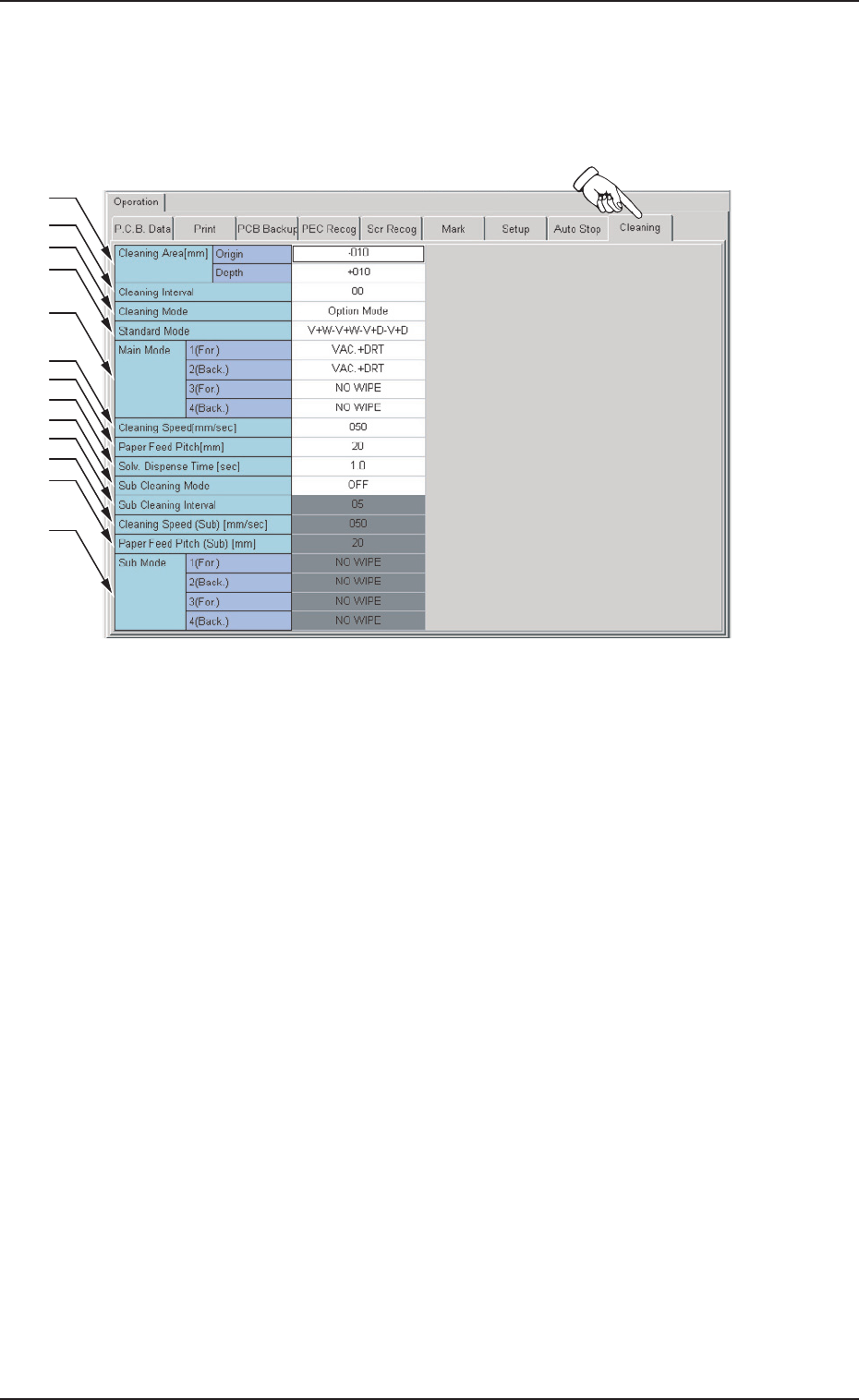 3-26 2.9 Cleaning( 清洁 ) 2.9 Cleaning( 清洁 ) 按“Operation( 操作数据 )”选项卡的 [Cleaning( 清洁 )]Tab,便显 示以下选项卡。 [1] [4] [5] [6] [2] [3] [7] [8] [9] [10] [11] [12] [13] Fig.C16 “Cleaning( 清洁 )”选项卡 [1] Cleaning Area( 清洁范围 ) 用键盘输入数值。 [2…