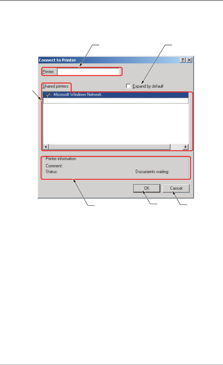 1-4 3. 印刷机的设定 [Network( 网络印刷机 )...] 按钮 在“Print Setup( 印刷 )”界面中, 点击 [Network( 网络印刷机 )...] 按钮,便显示以下界面。 [1] [2] [3] [4] [5] [6] Fig.A3 检索出已连接的网络印刷机,显示共享印刷机。 [1] Printer( 印刷机 ) 显示印刷机的名称。 [2] Shared printers( 共享印刷机 ) 显示网络印刷机。…