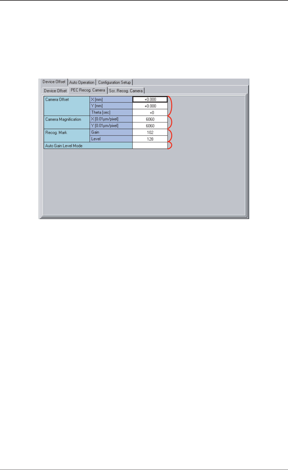 5-10 2.2 PEC Recog. Camera( 线路板识别照相机补正值 ) 2.2 PEC Recog. Camera( 线路板识别照相机补正值 ) 设定线路板识别照相机的补正量、倍率以及线路板识别标记的亮度、 浓淡差。 按“Device Offset( 补正值数据 )”子菜单界面的“PEC Recog. Camera( 线路板识别照相机补正值 )”Tab,便显示以下选项卡。 [1] [2] [3] [4] Fig.E14 “P…