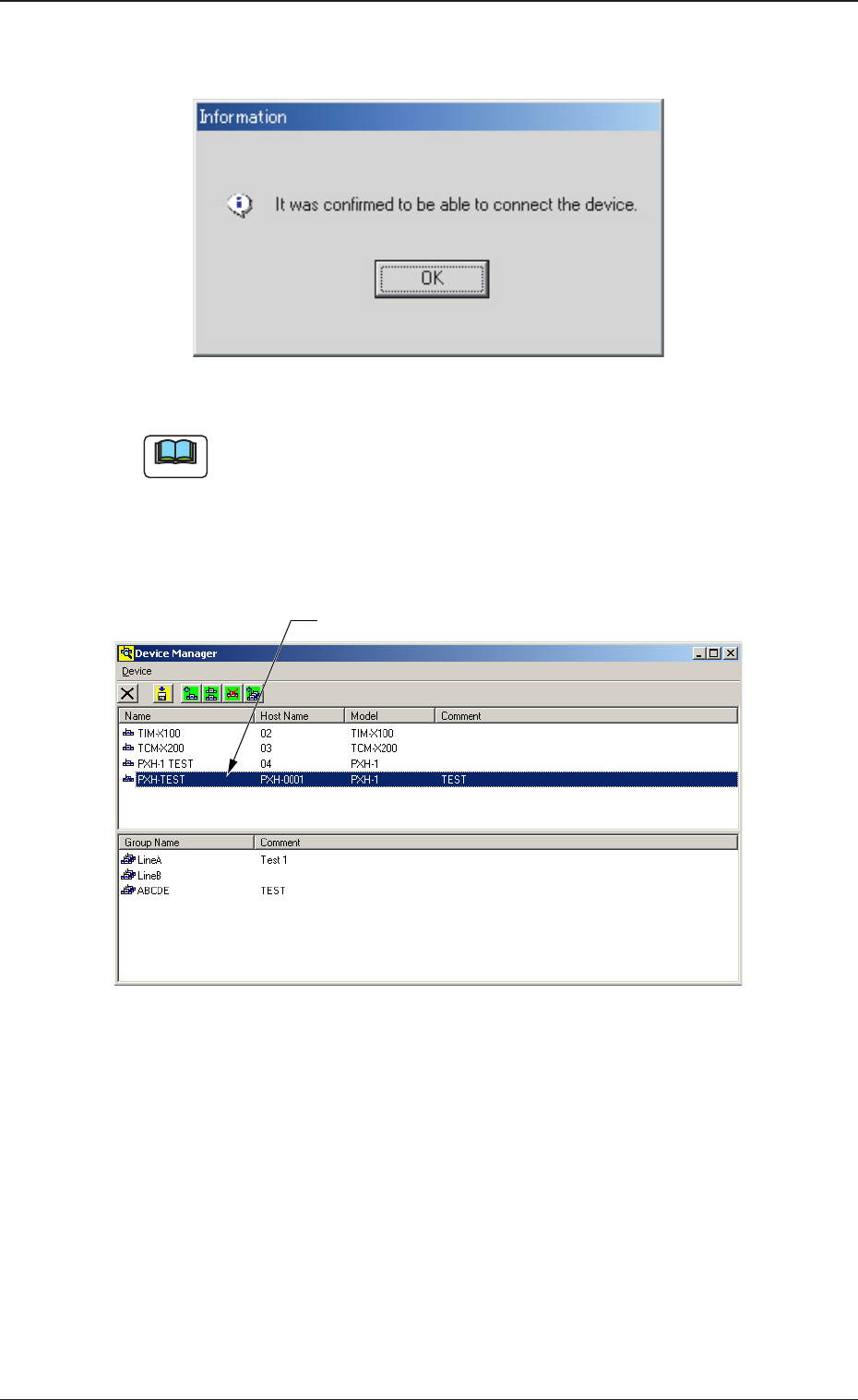 2-10 (6) 按下 [Check Connection( 连接检测 )] 按钮。 正确连接时,显示“Information( 信息 )”( 确认 ) 界面。 Fig.B6-1 Note 显示“ERROR( 异常 )”界面时,网络没有正确连接。 请确认主机名是否输入错误、电缆是否断线或连接器是否松弛。 (7) 按下 [OK( 确定 )] 按钮。 装置重新被登录。 重新登录的装置 Fig.B6-2 2.3 新装置的登录 0704-001
