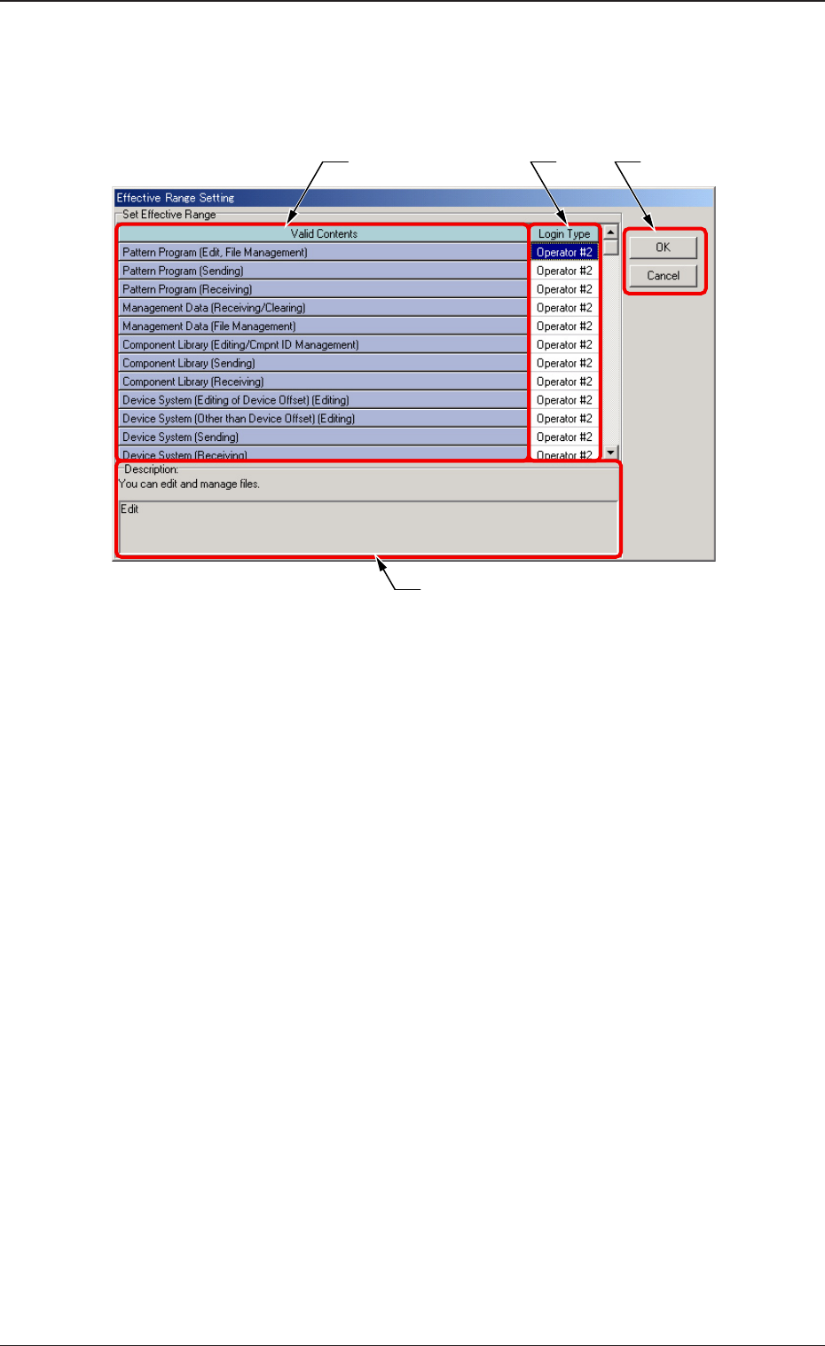 2-35 [3] [OK( 确定 )] 按钮、[Cancel( 放弃 )] 按钮 [OK( 确定 )] 按钮 若有效范围的设定上有变更,则适用变更内容后关闭“Effective Range Setting( 有效范围设定 )”界面。 [Cancel( 放弃 )] 按钮 不变更有效范围的设定而关闭“Effective Range Setting( 有效 范围设定 )”界面。 [4] Description( 说明 ) 显示选定项目的说明。…