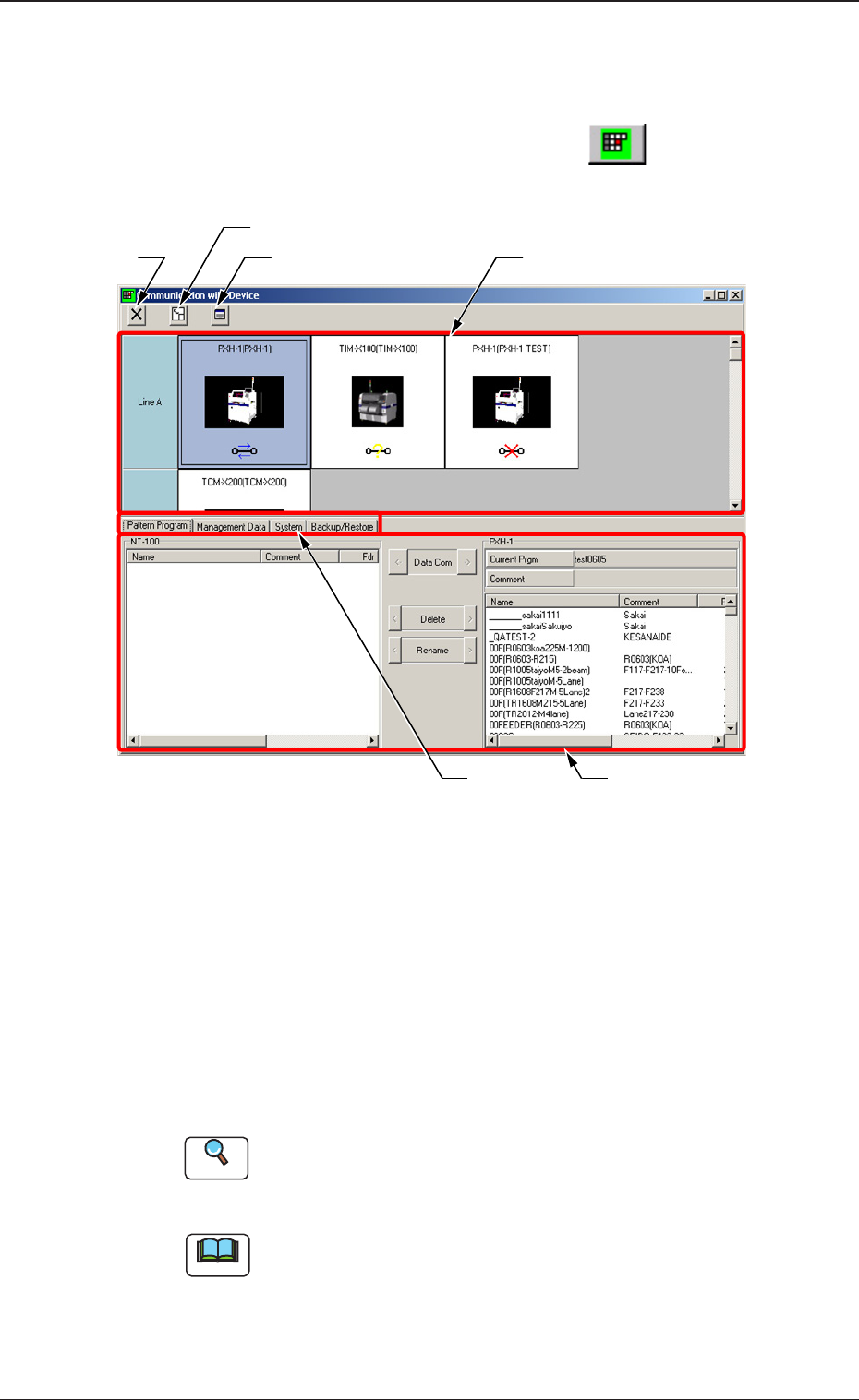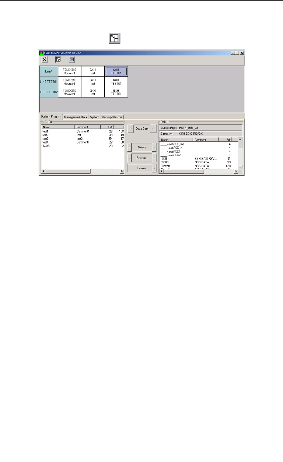 2-43 [5] Tab 显示以下 Tab。 Pattern Program( 线路板程序 ) 显示“Pattern Program( 线路板程序 )”通信选项卡。 Reference 详细内容请参照“4.2 线路板程序的通信”章节。 Management Data( 管理数据 ) 显示“Management Data( 管理数据 )”通信选项卡。 Reference 详细内容请参照“4.3 管理数据的通信”章节。 System( 系统…