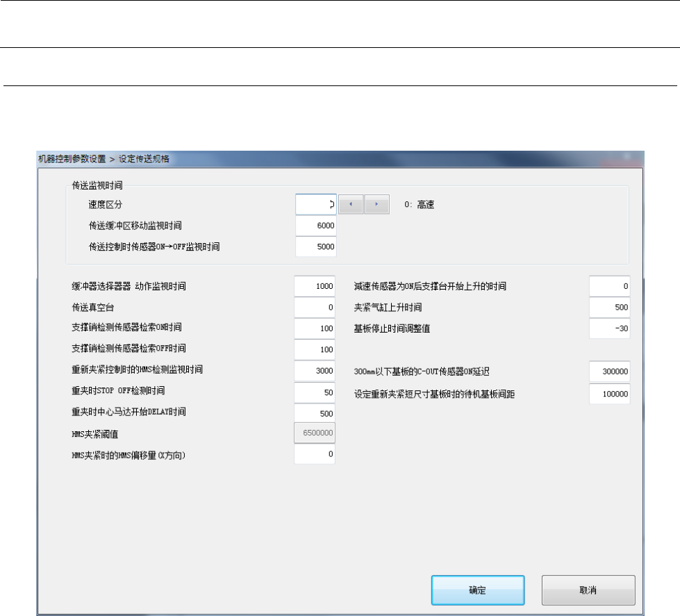 机器控制参数 2- 83 2-3-4 设定传送规格 如将 “速度区分” 设置为欲编辑的索引, 即 可对所设置的区分的 “传送 缓冲 区移动监视时间 ” 、“ 传 送控制时传感器 ON → OFF 监视 时间”进行编辑。