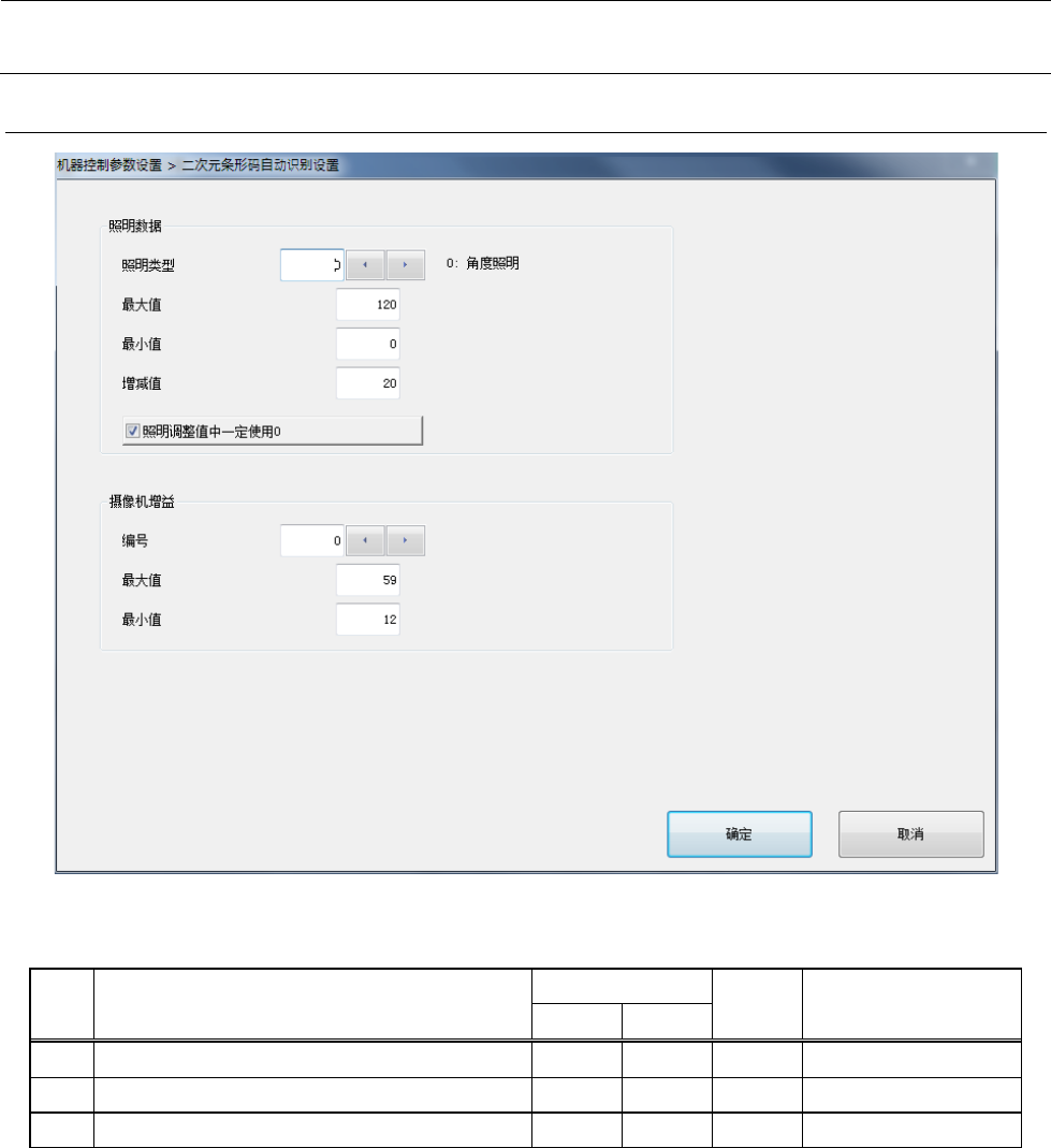 机器控制参数 2- 112 2-4-16 二维条形码自动识 别设置 设定项目 2-4-16- 1 No. 项目 输入范围 单位 备考 最小值 最大值 1 照明数据 照明类型 0 2 0 :角度照明 1 :垂直照明 2 : 外圈照明 (选项 ) 2 最大值 3 最小值 4 増减值 5 照明调整值中一定使 用 0 6 摄像机增益 编号 0 31 7 最大值 8 最小值