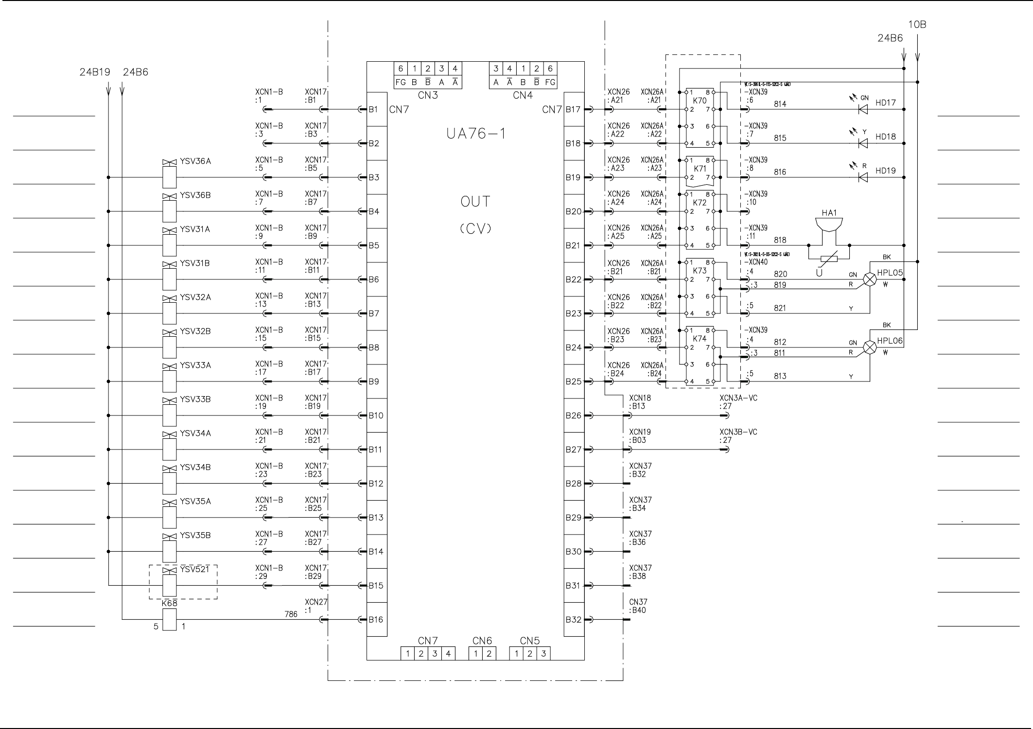 Note 2: The area enclosed by a dashed line is located inside the I/O relay board (UA92).
