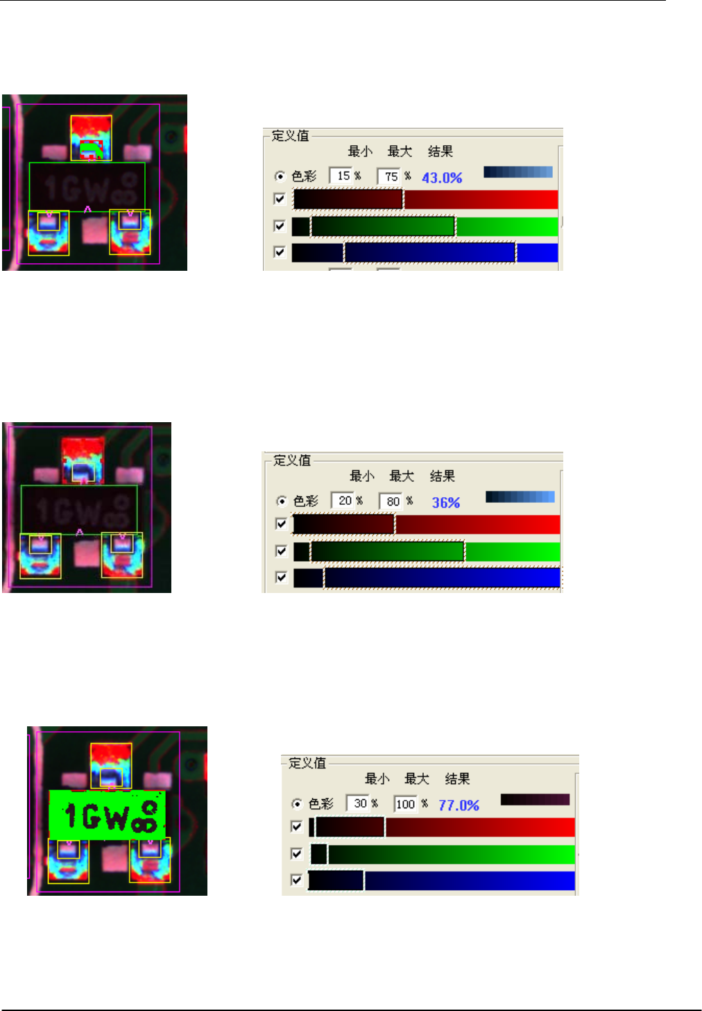 颜色调整如下:R:0~70、G:0~15、B:0~45,最小检测值设定为 30%。丝印制作方法与电阻相同,