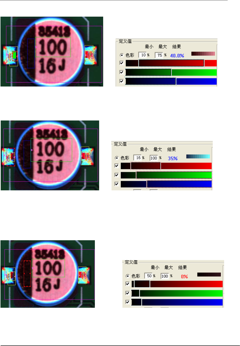 右键,电脑自动分析本体颜色,并设定检测颜色值。电容本体颜色设定时,单项颜色的长度不能超过 60,