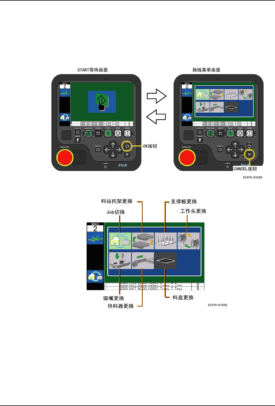 此时,在 START 等待画面上请按下 OK 按钮,切换到换线菜单画面。当按下 CANSEL 按钮后就