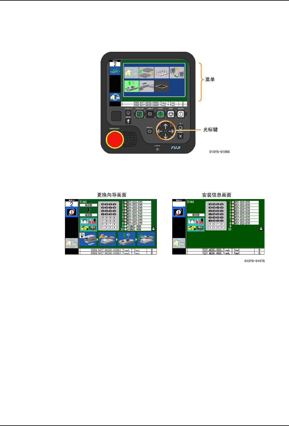 QD027-17 5. 换线 NXT 系统手册 155 5.2.2 操作方法 1. 在 START 等待的状态下,按下操作面板的 OK 按钮,显示换线菜单画面。 2. 请通过操作面板的光标键选择菜单。所 选择的菜单的背景变成绿色。 备注 ) 背景为深灰色时,表示无法选择的菜单。 3. 请按下操作面板的 OK 按钮。 如果所选择的菜单需要进行换线时, 显示更换向导画面。 如 果不需要换线时,显示安装信息 画面。 备注 ) 以上画面是选择了…