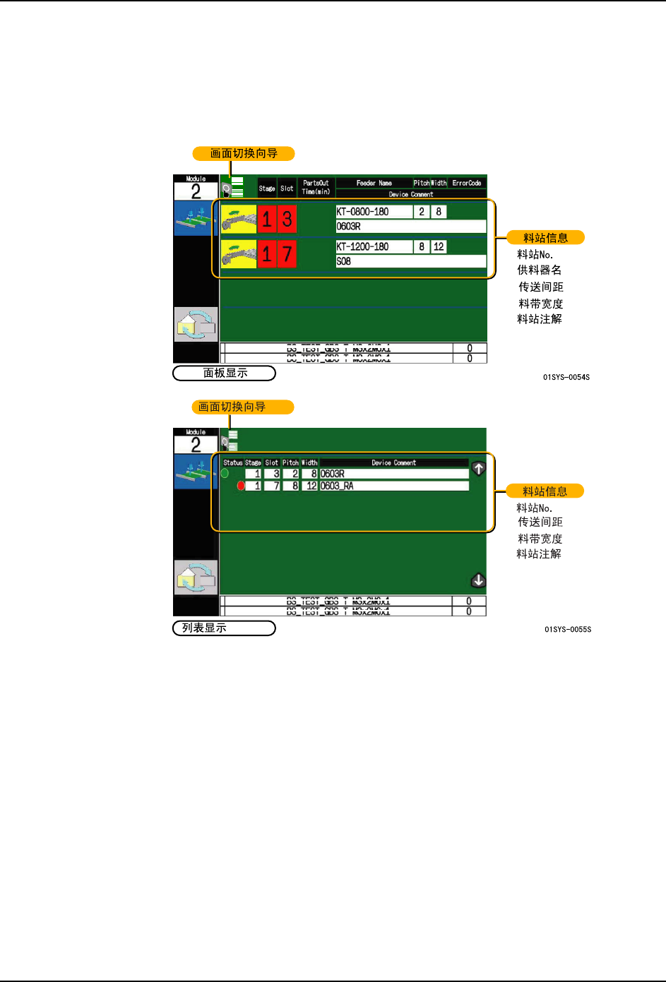 在 [ 列表显示 ] 画面上,能够知道安装更换供料器的场所。按上下键 (光标键),画面就会