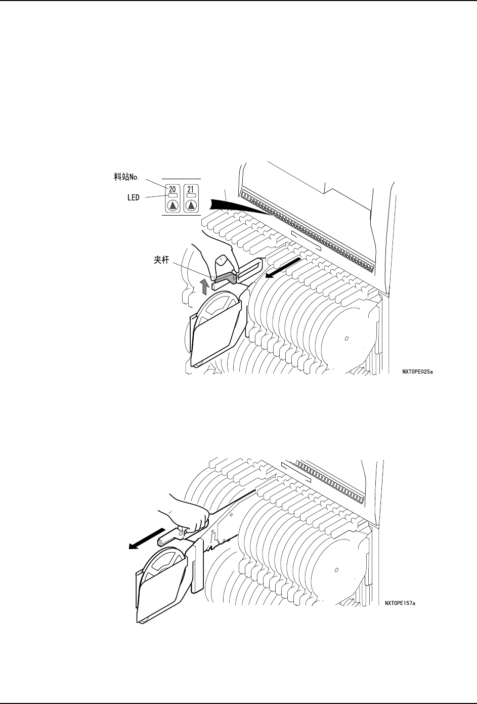 QD027-17 5. 换线 NXT 系统手册 159 5.4.2 供料器的卸下和安装 使用 Fuj itrax Verifier 时, 需要有 供料器与料卷间的相 关设置。 详细请 参照 NX T 编程手册 的 [7.Fujitrax Verifier] - [ 创建供料器与料卷之间的关系 ]。 1. 如果安装在前面门上的 LED 点亮 , 则说明该料站 No. 需要更换或者检查供料器。 有必要 更换供料器时如下图所示,提起 供料器的…