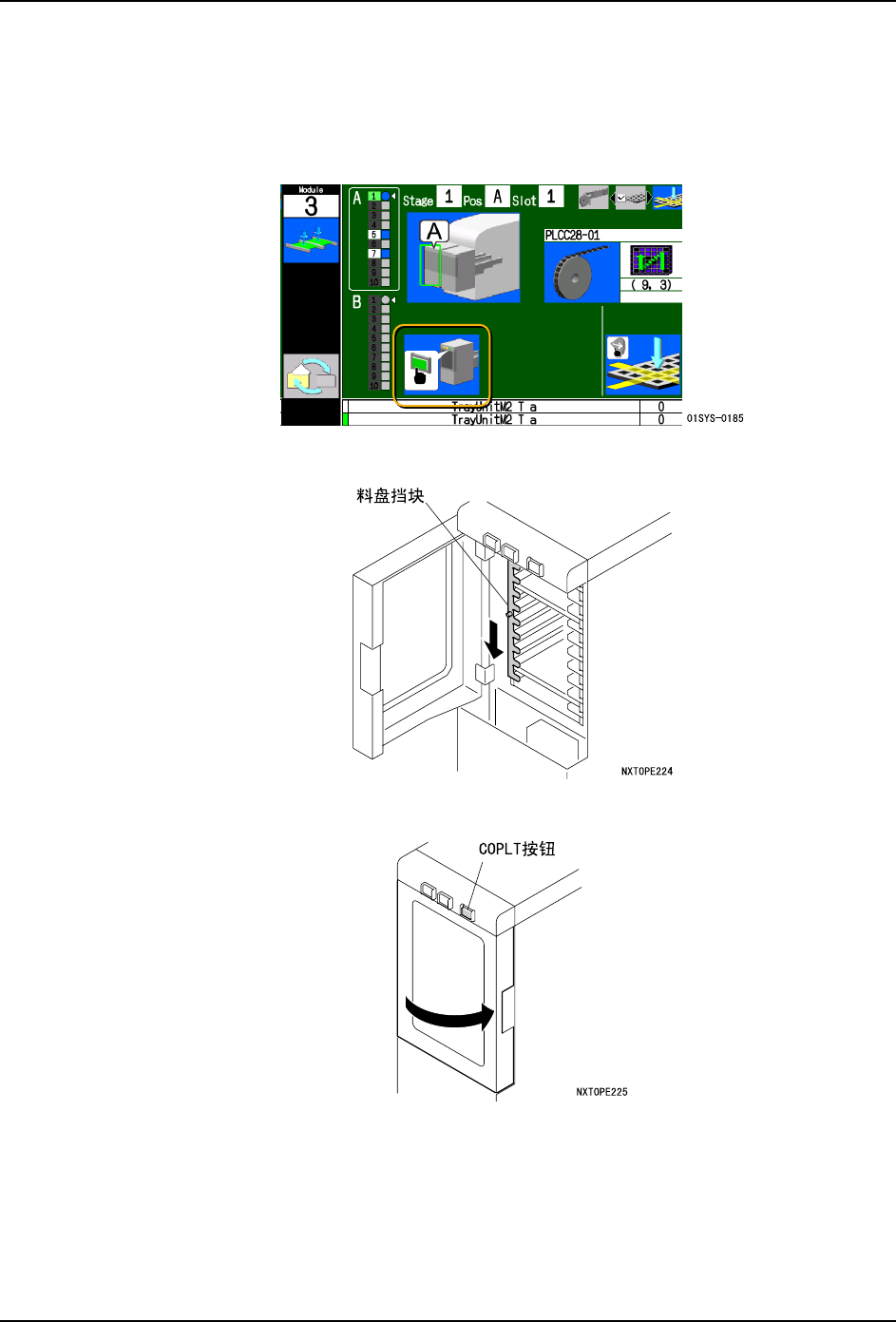 QD027-17 5. 换线 NXT 系统手册 181 5.6.3 [Verify OFF] 时 1. 打开料盘单元 -M 的正门。 2. 请提起料盘挡块。 3. 一边在作业向导画面上进行确认,一边 将料盘设置在正确的料站位置上。 注意 ) 在将料盘放置到料站时, 请轻轻放置以免产生冲击。另外,请不要使料盘接触到料站最里面的 挡块。如果接触,请将料盘退回一些。