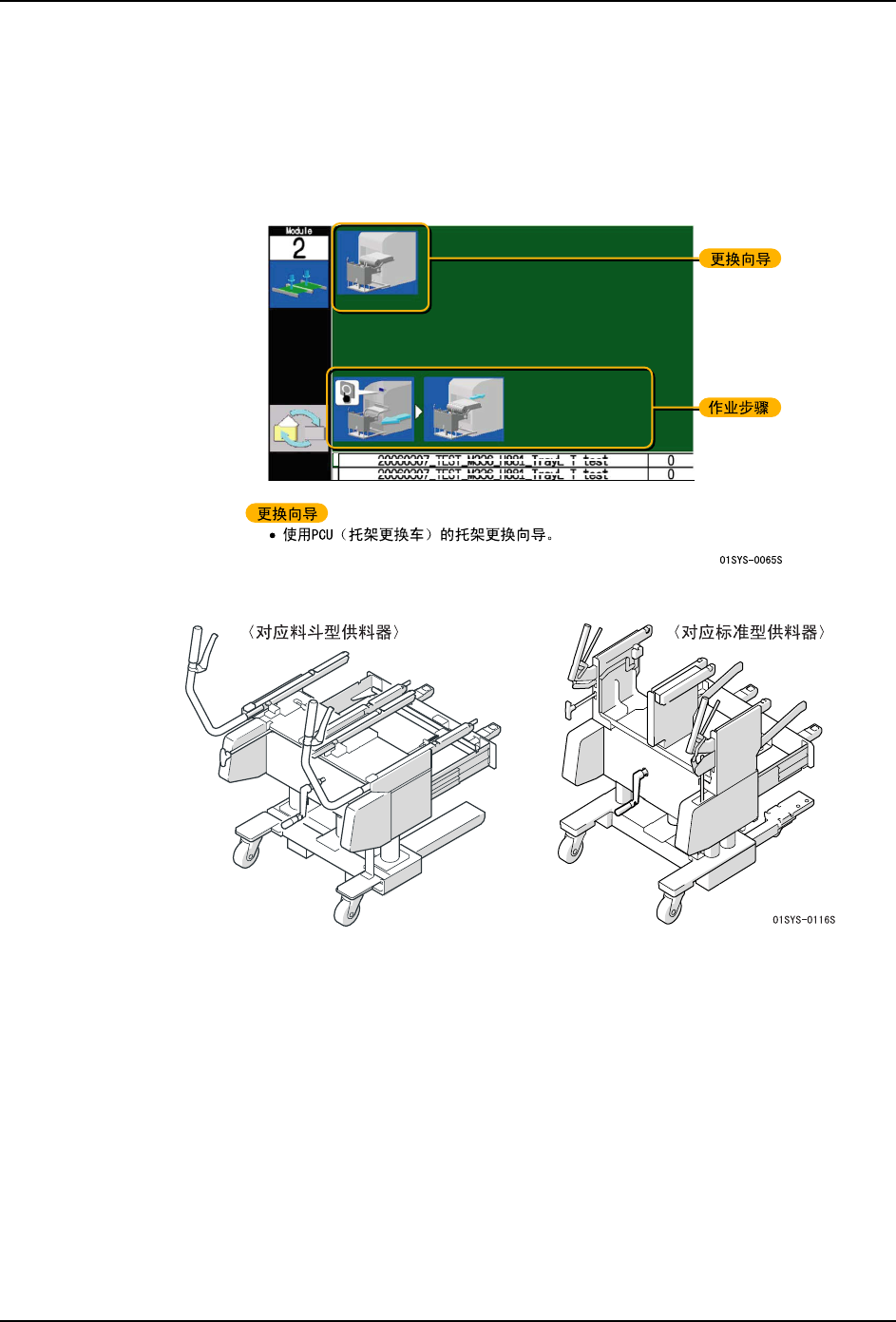 备注 ) 在料站的一次性换线时,更换每个料站托架。需要专用的 PCU (料站托架更换车)。